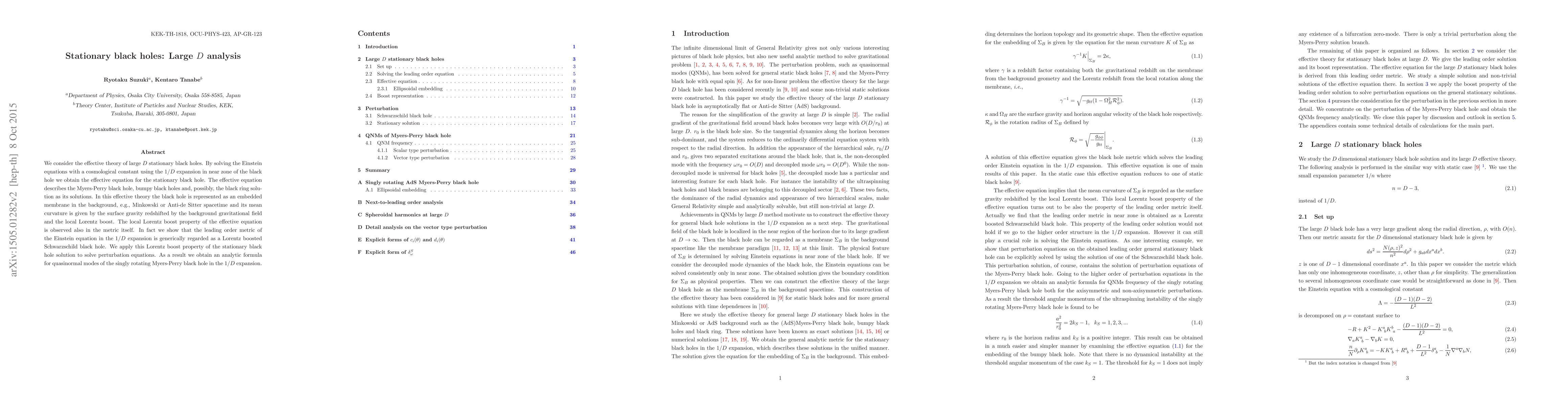 This paper explores the effective theory of large D stationary black holes using a 1/D expansion, revealing the effective equation describing Myers-Perry black holes, bumpy black holes, and potentially black rings. It demonstrates the Lorentz boost property in the metric and provides an analytic formula for the quasinormal mode of the singly rotating Myers-Perry black hole.