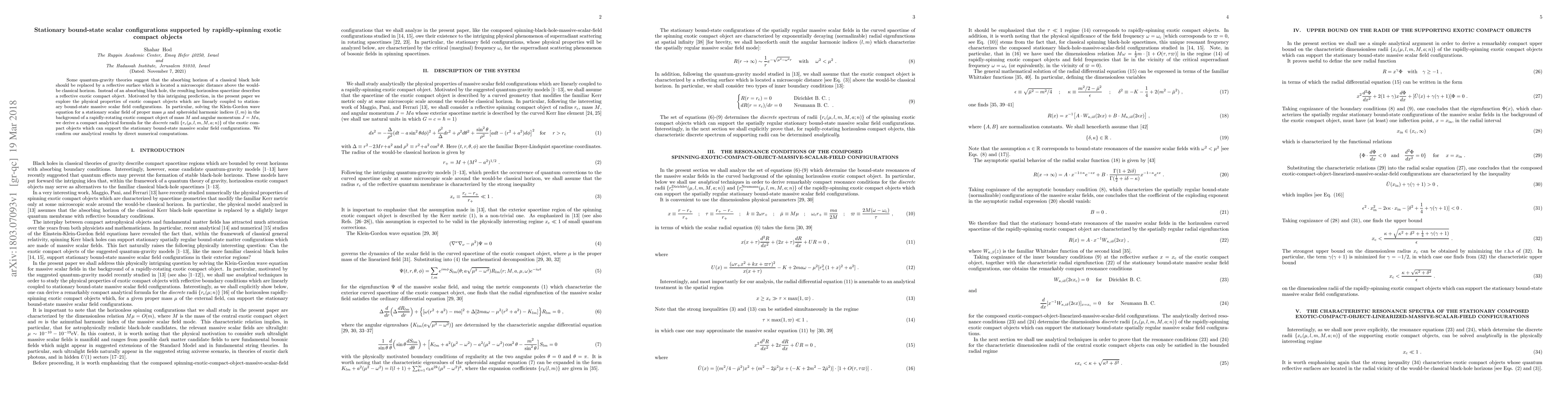 Some quantum-gravity theories suggest that the absorbing horizon of a classical black hole should be replaced by a reflective surface which is located a microscopic distance above the would-be classical horizon. Instead of an absorbing black hole, the resulting horizonless spacetime describes a reflective exotic compact object. Motivated by this intriguing prediction, in the present paper we explore the physical properties of exotic compact objects which are linearly coupled to stationary bound-state massive scalar field configurations. In particular, solving the Klein-Gordon wave equation for a stationary scalar field of proper mass $\mu$ and spheroidal harmonic indices $(l,m)$ in the background of a rapidly-rotating exotic compact object of mass $M$ and angular momentum $J=Ma$, we derive a compact analytical formula for the {\it discrete} radii $\{r_{\text{c}}(\mu,l,m,M,a;n)\}$ of the exotic compact objects which can support the stationary bound-state massive scalar field configurations. We confirm our analytical results by direct numerical computations.