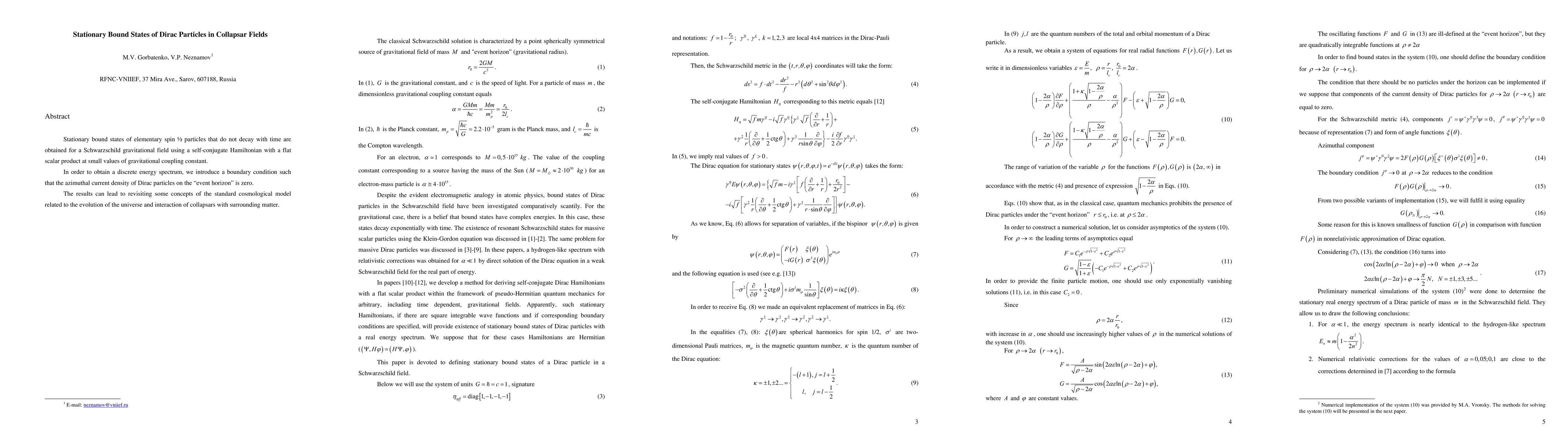 Stationary bound states of elementary spin 1/2 particles that do not decay with time are obtained for a Schwarzschild gravitational field using a self-conjugate Hamiltonian with a flat scalar product at small values of gravitational coupling constant. In order to obtain a discrete energy spectrum, we introduce a boundary condition such that the azimuthal current density of Dirac particles on the "event horizon" is zero. The results can lead to revisiting some concepts of the standard cosmological model related to the evolution of the universe and interaction of collapsars with surrounding matter.