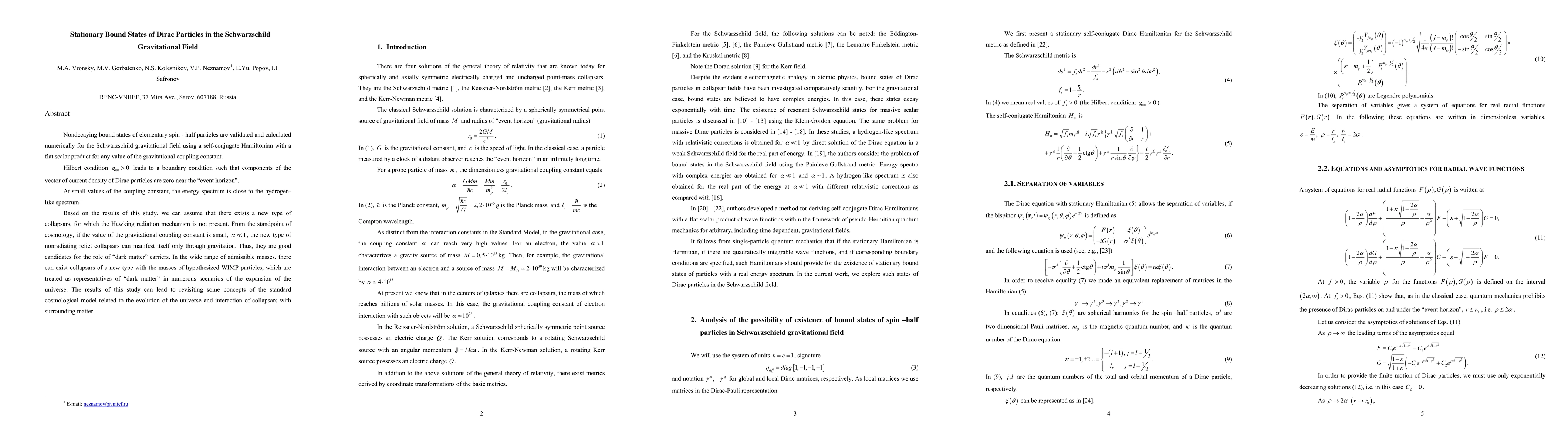 Nondecaying bound states of elementary spin-half particles are validated and calculated numerically for the Schwarzschild gravitational field using a self-conjugate Hamiltonian with a flat scalar product for any value of the gravitational coupling constant. Hilbert condition g_{00}>0 leads to a boundary condition such that components of the vector of current density of Dirac particles are zero near the "event horizon". At small values of the coupling constant, the energy spectrum is close to the hydrogen-like spectrum. Based on the results of this study, we can assume that there exists a new type of collapsars, for which the Hawking radiation mechanism is not present. From the standpoint of cosmology, if the value of the gravitational coupling constant is small, alpha<<1, the new type of nonradiating relict collapsars can manifest itself only through gravitation. Thus, they are good candidates for the role of "dark matter" carriers. In the wide range of admissible masses, there can exist collapsars of a new type with the masses of hypothesized WIMP particles, which are treated as representatives of "dark matter" in numerous scenarios of the expansion of the universe. The results of this study can lead to revisiting some concepts of the standard cosmological model related to the evolution of the universe and interaction of collapsars with surrounding matter.