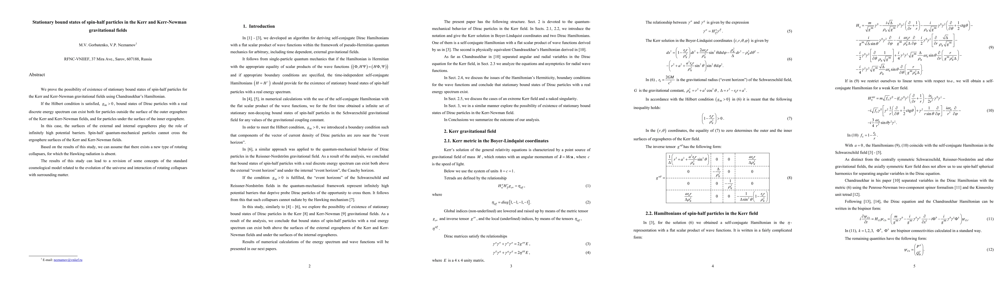 This paper demonstrates the existence of stationary bound states of spin-half particles in Kerr and Kerr-Newman gravitational fields, suggesting that Dirac particles can exist with a discrete energy spectrum outside the ergospheres. It implies the absence of Hawking radiation in a new type of rotating collapsars, potentially revising standard cosmological models.