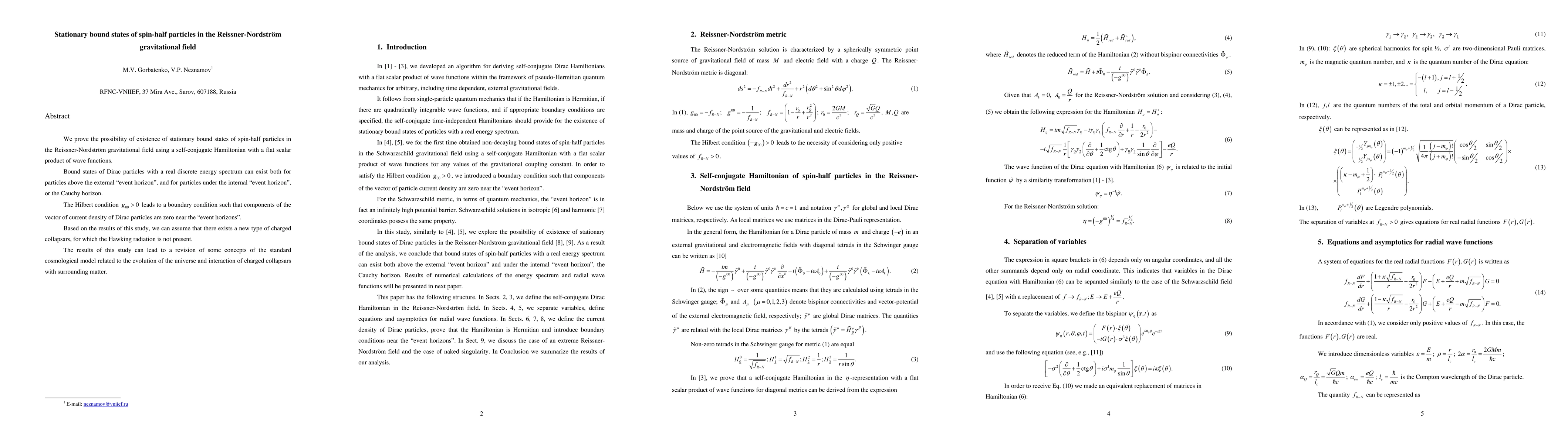 This paper demonstrates the existence of stationary bound states for spin-half particles in a Reissner-Nordström gravitational field, revealing potential new types of charged collapsars without Hawking radiation, which may revise standard cosmological models. The study employs a self-conjugate Hamiltonian and finds bound states both above and below the event horizons.
