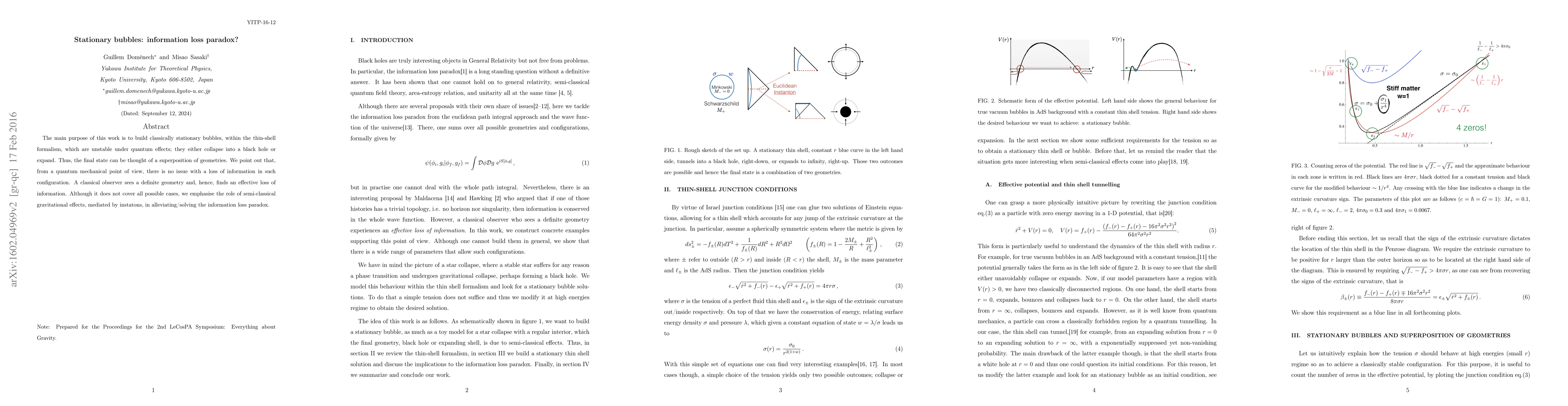 This paper explores stationary bubbles in the thin-shell formalism, showing they can collapse or expand due to quantum effects, leading to a superposition of geometries. It argues that quantum mechanics resolves the information loss paradox, while classical observers may perceive an effective loss of information.