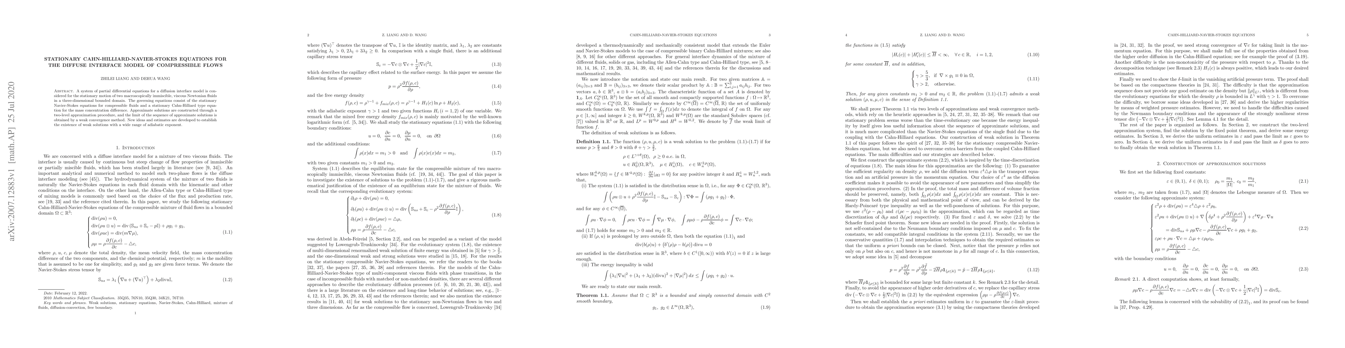 This paper investigates stationary partial differential equations for a diffusion interface model describing the motion of two immiscible, viscous Newtonian fluids. It constructs approximate solutions using a two-level approximation and establishes the existence of weak solutions through weak convergence, introducing new ideas and estimates for a broad range of adiabatic exponents.