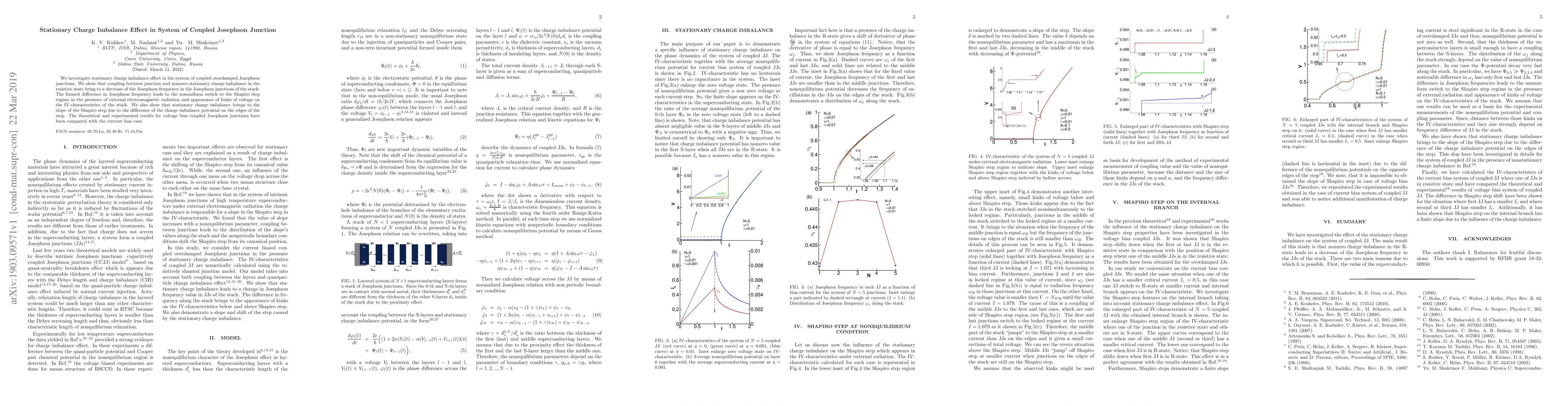 This paper investigates the stationary charge imbalance effect in coupled overdamped Josephson junctions, demonstrating that it decreases the Josephson frequency and causes nonuniform switching to the Shapiro step regime under external electromagnetic radiation, leading to voltage kinks in the IV-characteristics. Theoretical and experimental results show that stationary charge imbalance also slopes the Shapiro step due to the potential difference across the step edges.