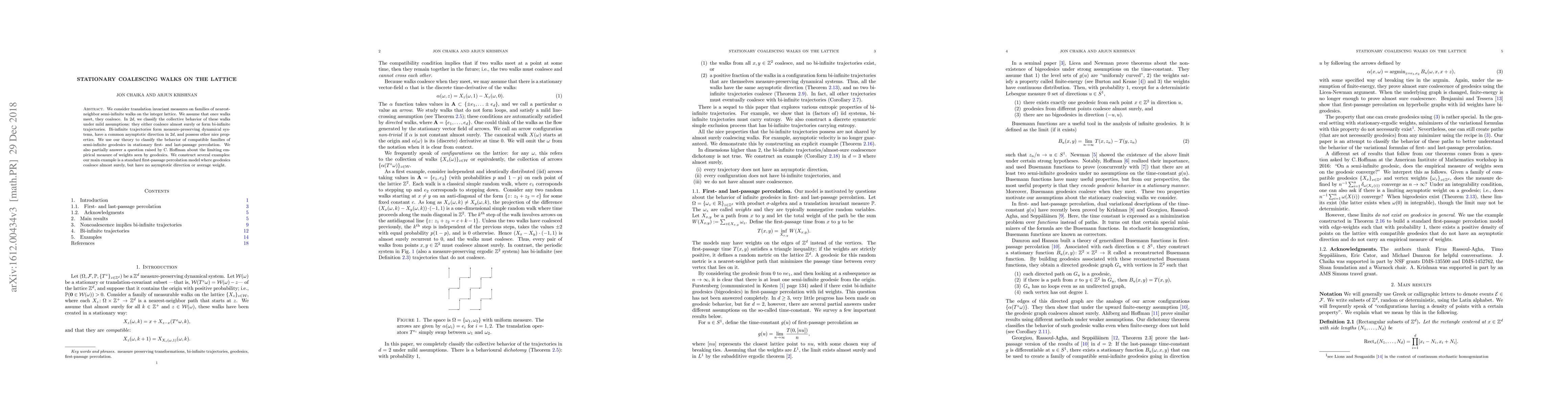 We consider translation invariant measures on families of nearest-neighbor semi-infinite walks on the integer lattice. We assume that once walks meet, they coalesce. In $2d$, we classify the collective behavior of these walks under mild assumptions: they either coalesce almost surely or form bi-infinite trajectories. Bi-infinite trajectories form measure-preserving dynamical systems, have a common asymptotic direction in $2d$, and possess other nice properties. We use our theory to classify the behavior of compatible families of semi-infinite geodesics in stationary first- and last-passage percolation. We also partially answer a question raised by C. Hoffman about the limiting empirical measure of weights seen by geodesics. We construct several examples: our main example is a standard first-passage percolation model where geodesics coalesce almost surely, but have no asymptotic direction or average weight.