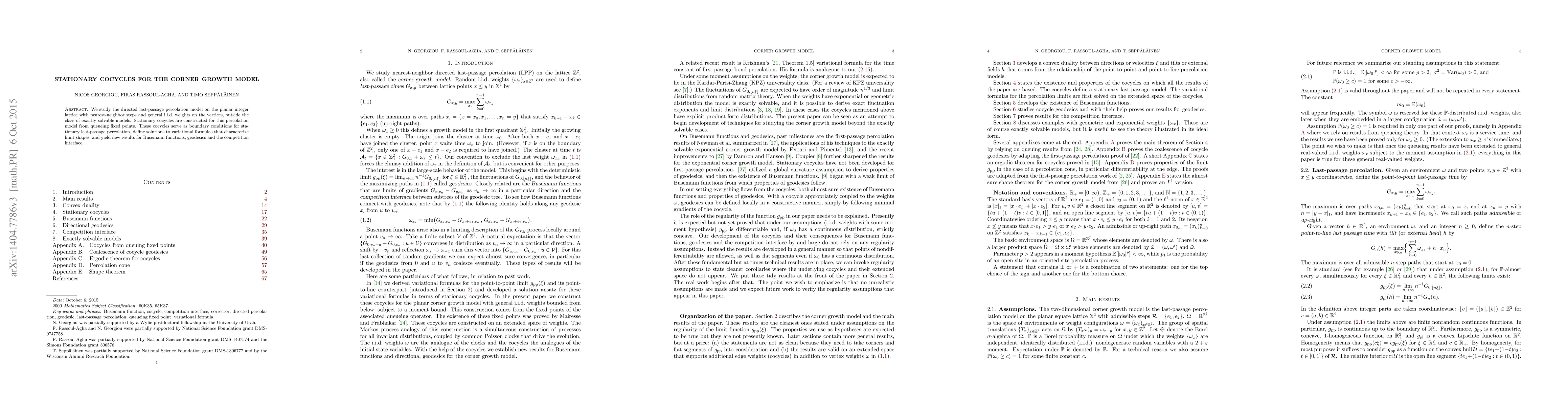 We study the directed last-passage percolation model on the planar integer lattice with nearest-neighbor steps and general i.i.d. weights on the vertices, outside the class of exactly solvable models. Stationary cocycles are constructed for this percolation model from queueing fixed points. These cocycles serve as boundary conditions for stationary last-passage percolation, define solutions to variational formulas that characterize limit shapes, and yield new results for Busemann functions, geodesics and the competition interface.