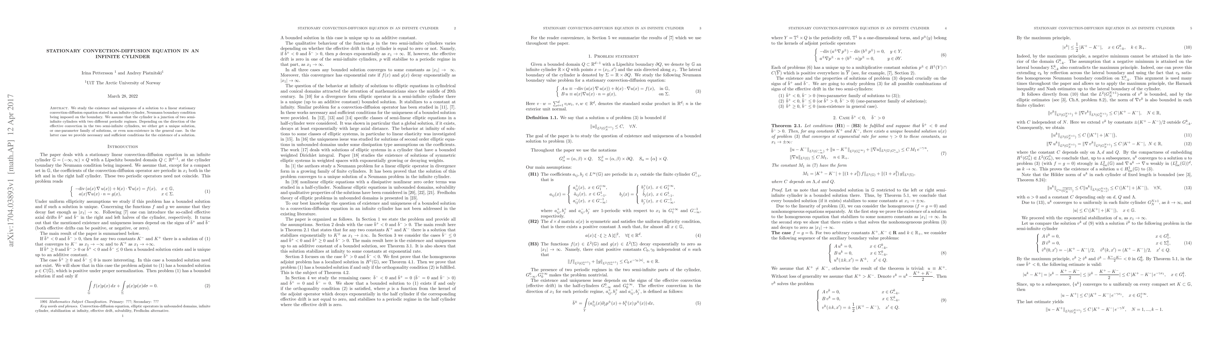 This paper investigates the existence and uniqueness of solutions to a stationary convection-diffusion equation in an infinite cylinder with Neumann boundary conditions. It finds that the solution depends on the convection direction in two semi-infinite cylinders, leading to unique, multiple, or no solutions, with specific conditions provided for non-existence cases.