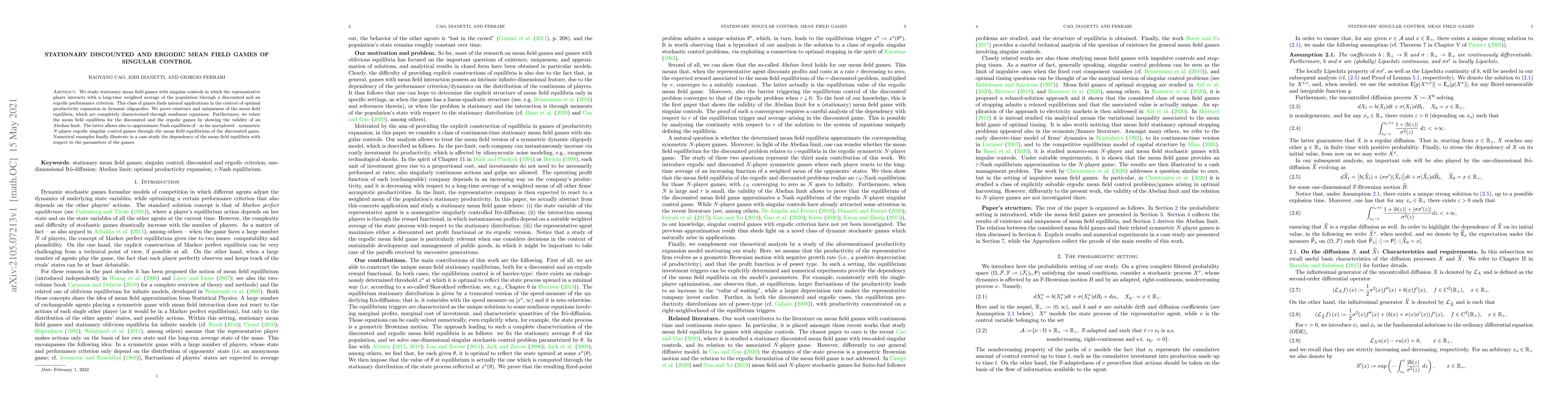 This paper investigates stationary mean field games with singular controls, focusing on discounted and ergodic performance criteria. It proves the existence and uniqueness of mean field equilibria characterized by nonlinear equations and demonstrates an Abelian limit relating discounted and ergodic games, enabling the approximation of N-player ergodic singular control games via mean field equilibria.