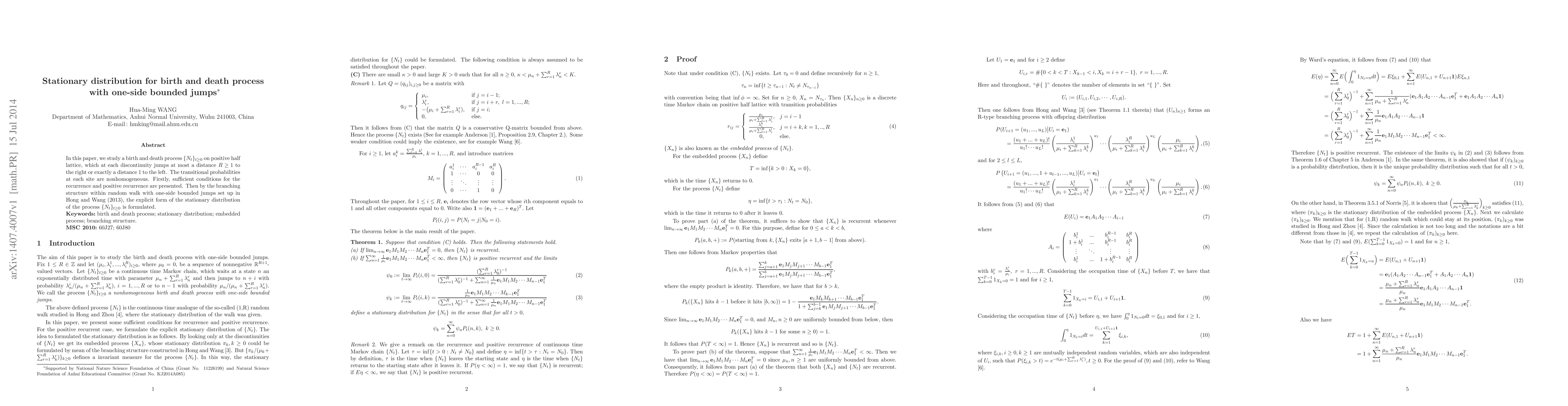 In this paper, we study a birth and death process $\{N_t\}_{t\ge0}$ on positive half lattice, which at each discontinuity jumps at most a distance $R\ge 1$ to the right or exactly a distance $1$ to the left. The transitional probabilities at each site are nonhomogeneous. Firstly, sufficient conditions for the recurrence and positive recurrence are presented. Then by the branching structure within random walk with one-side bounded jumps set up in Hong and Wang (2013), the explicit form of the stationary distribution of the process $\{N_t\}_{t\ge0}$ is formulated.
