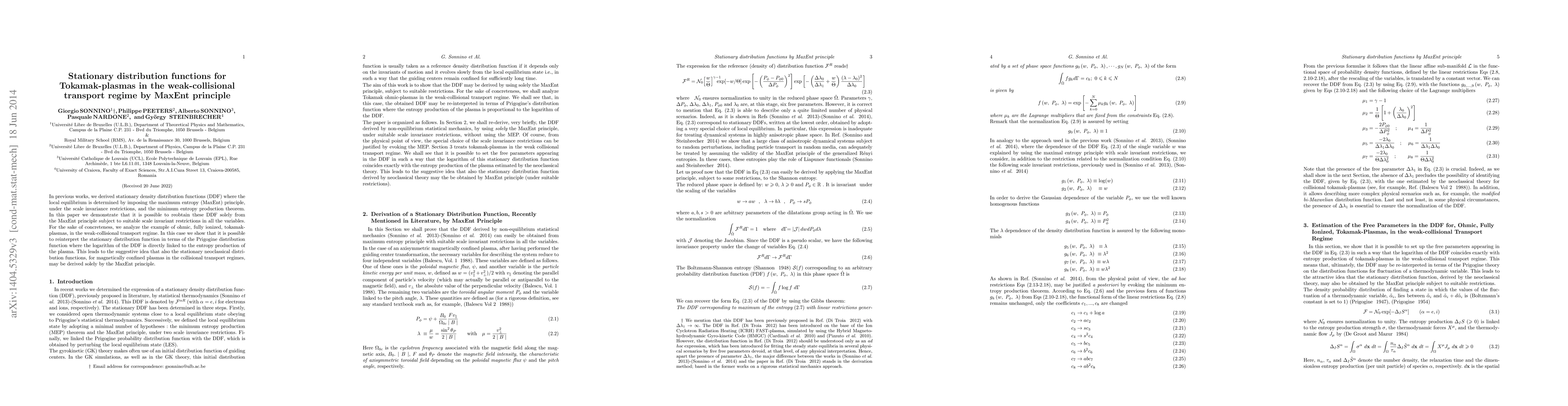 This paper demonstrates that stationary density distribution functions for weak-collisional Tokamak-plasmas can be derived solely from the MaxEnt principle under scale invariant restrictions. It reinterprets these functions in terms of the Prigogine distribution function, linking the logarithm of the distribution to plasma entropy production.