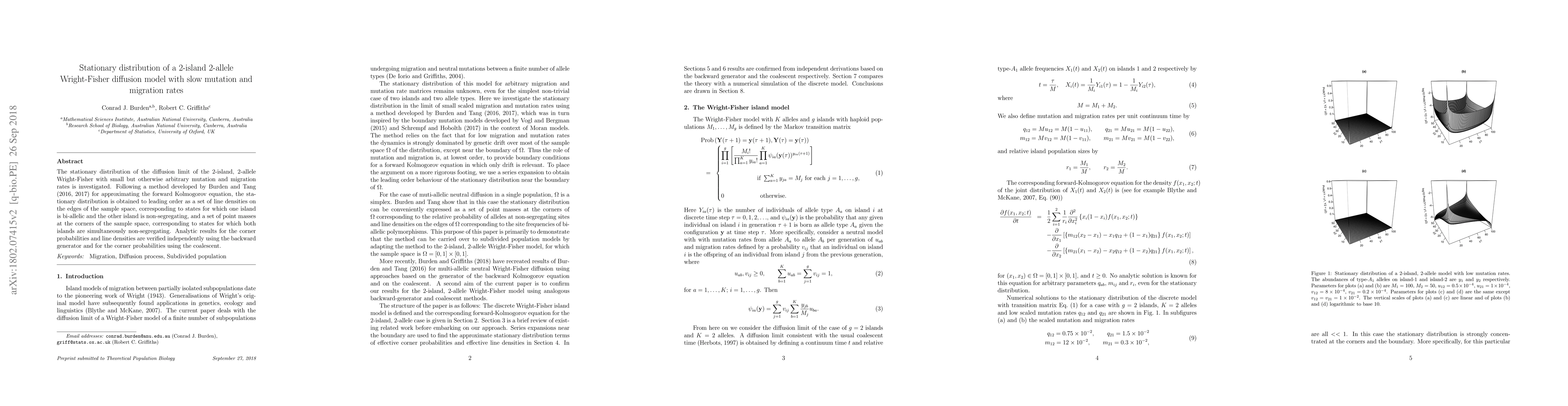 The research paper investigates the stationary distribution of a 2-island Wright-Fisher model with small mutation and migration rates, finding that it approximates states where one island is bi-allelic or both islands are non-segregating.