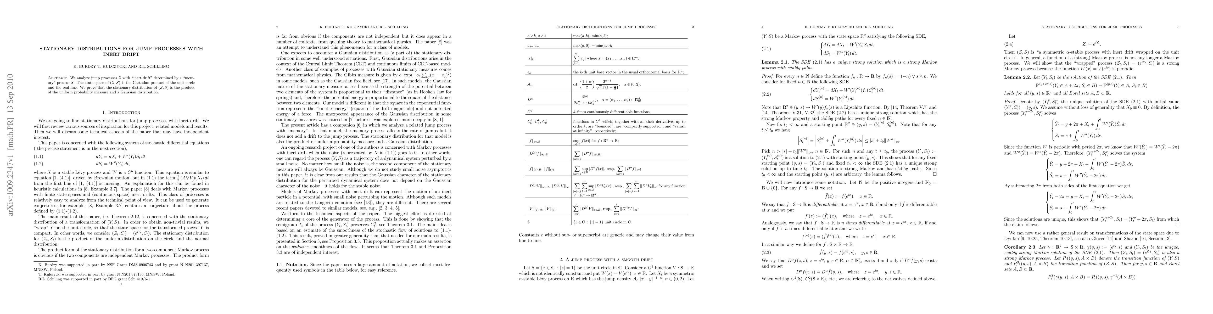 The research analyzes jump processes with inert drift, focusing on their stationary distributions. It proves that the stationary distribution of the combined process (Z,S) is the product of the uniform probability measure on the unit circle and a Gaussian distribution.
