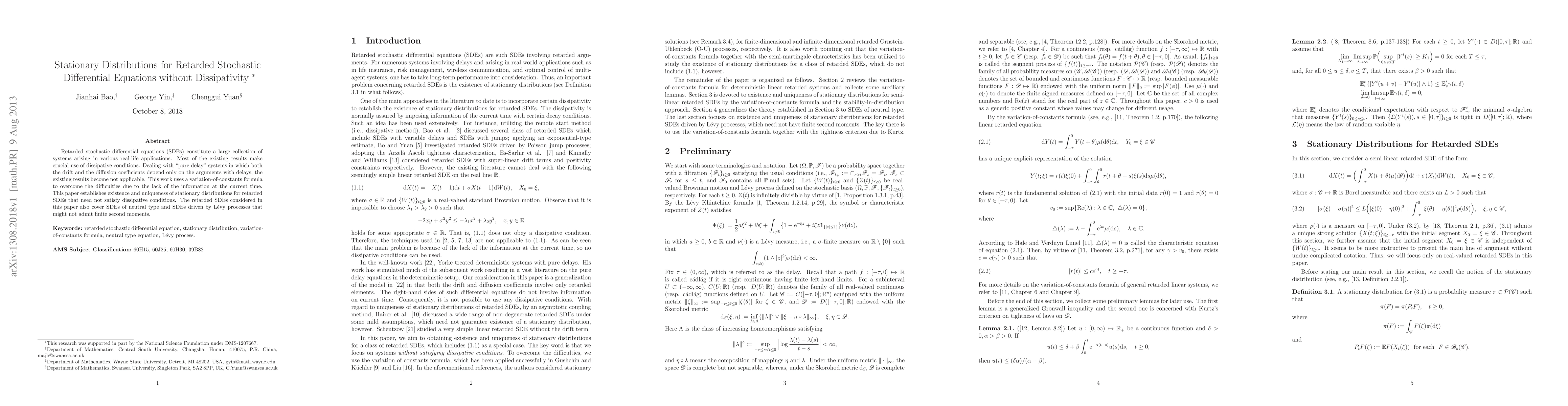 Retarded stochastic differential equations (SDEs) constitute a large collection of systems arising in various real-life applications. Most of the existing results make crucial use of dissipative conditions. Dealing with "pure delay" systems in which both the drift and the diffusion coefficients depend only on the arguments with delays, the existing results become not applicable. This work uses a variation-of-constants formula to overcome the difficulties due to the lack of the information at the current time. This paper establishes existence and uniqueness of stationary distributions for retarded SDEs that need not satisfy dissipative conditions. The retarded SDEs considered in this paper also cover SDEs of neutral type and SDEs driven by L\'{e}vy processes that might not admit finite second moments.