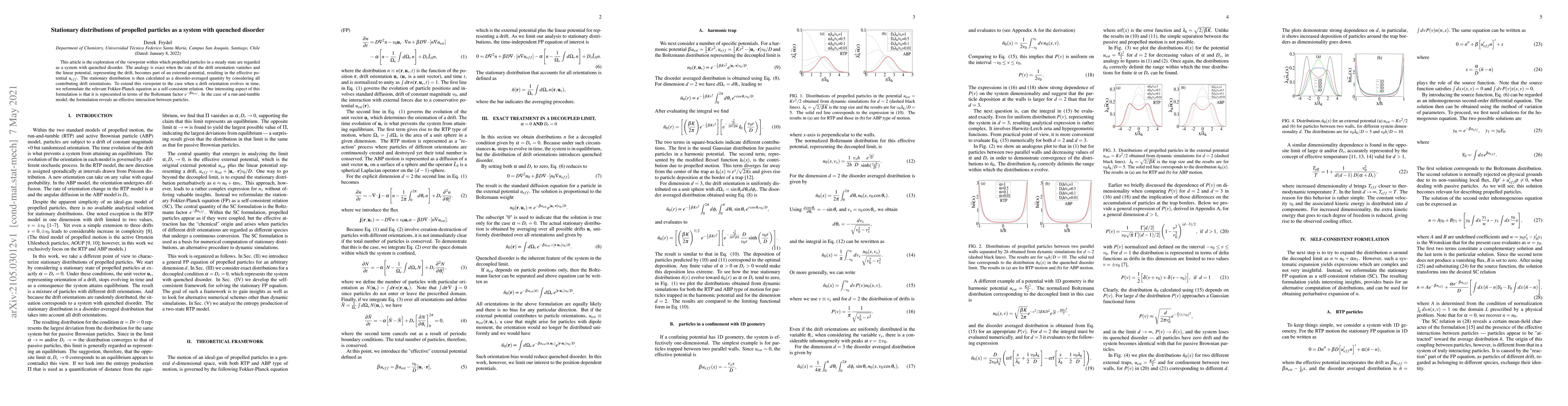 This article is the exploration of the viewpoint within which propelled particles in a steady-state are regarded as a system with quenched disorder. The analogy is exact when the rate of the drift orientation vanishes and the linear potential, representing the drift, becomes part of an external potential, resulting in the effective potential $u_{eff}$. The stationary distribution is then calculated as a disorder-averaged quantity by considering all contributing drift orientations. To extend this viewpoint to the case when a drift orientation evolves in time, we reformulate the relevant Fokker-Planck equation as a self-consistent relation. One interesting aspect of this formulation is that it is represented in terms of the Boltzmann factor $e^{-\beta u_{eff}}$. In the case of a run-and-tumble model, the formulation reveals an effective interaction between particles.