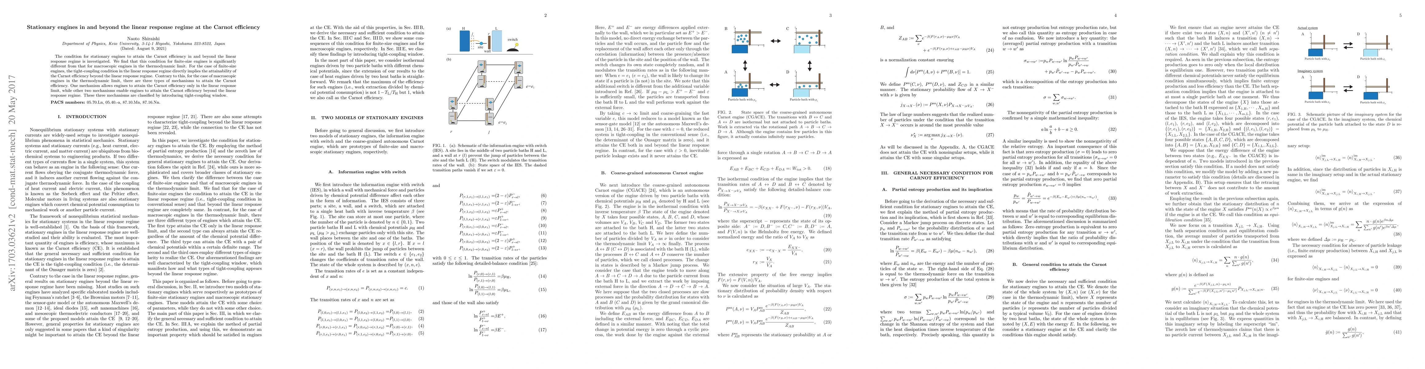 The paper investigates conditions for stationary engines to achieve Carnot efficiency, revealing that finite-size engines require tight-coupling in the linear response regime to reach efficiency beyond this regime, while macroscopic engines can achieve it via three distinct mechanisms, only one of which operates strictly within the linear response limit.