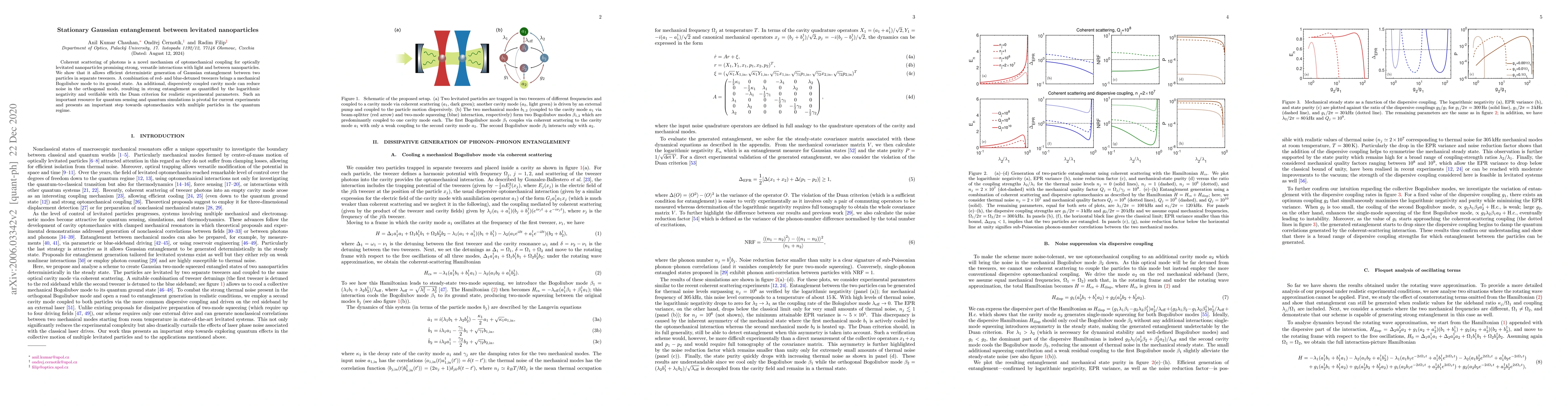 Coherent scattering of photons is a novel mechanism of optomechanical coupling for optically levitated nanoparticles promising strong, versatile interactions with light and between nanoparticles. We show that it allows efficient deterministic generation of Gaussian entanglement between two particles in separate tweezers. A combination of red- and blue-detuned tweezers brings a mechanical Bogoliubov mode to its ground state. An additional, dispersively coupled cavity mode can reduce noise in the orthogonal mode, resulting in strong entanglement as quantified by the logarithmic negativity and verifiable with the Duan criterion for realistic experimental parameters. Such an important resource for quantum sensing and quantum simulations is pivotal for current experiments and presents an important step towards optomechanics with multiple particles in the quantum regime.