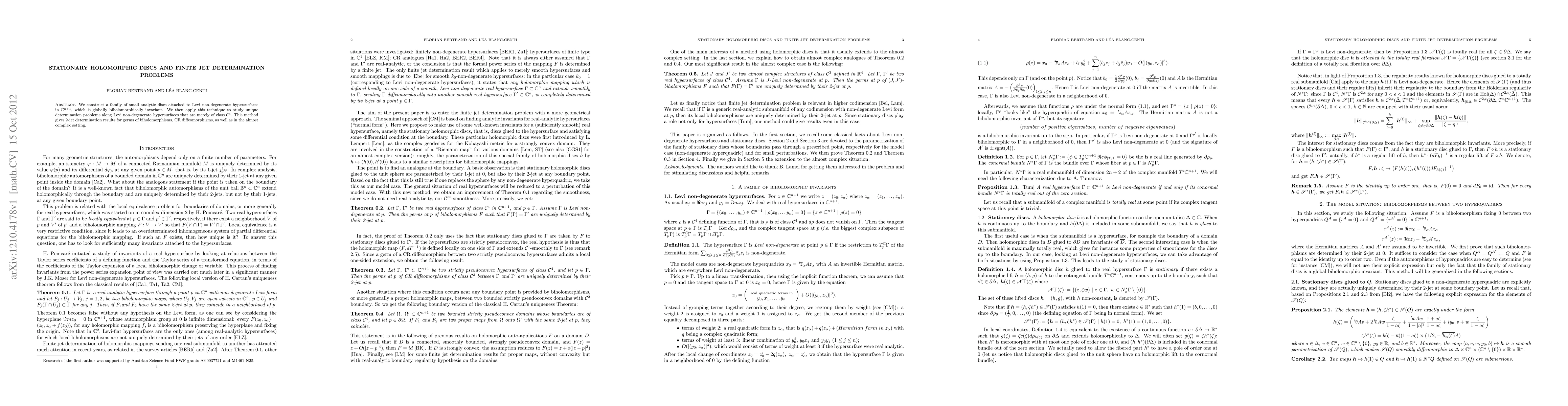 This paper constructs a globally biholomorphically invariant family of small analytic discs attached to Levi non-degenerate hypersurfaces in $\mathbb{C}^{n+1}$, and applies this to achieve 2-jet determination results for biholomorphisms, CR diffeomorphisms, and almost complex settings on $\mathcal{C}^4$ class hypersurfaces.