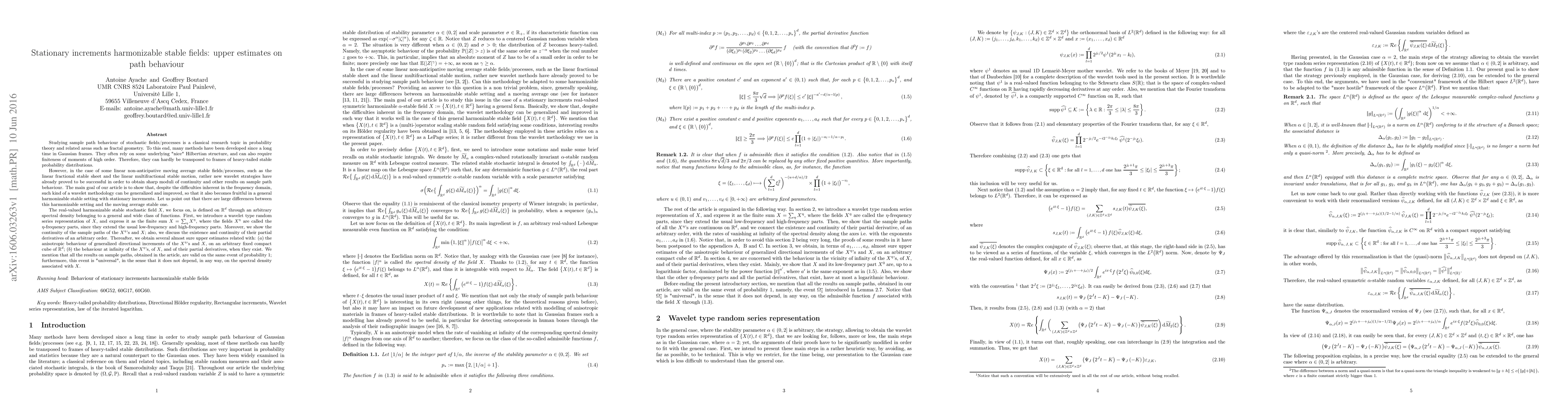 This paper explores the sample path behavior of harmonizable stable fields with stationary increments, extending wavelet methodologies to provide upper estimates on path behavior. Unlike Gaussian methods, this approach is tailored for heavy-tailed distributions, offering sharp moduli of continuity and results applicable in a broader stable setting.