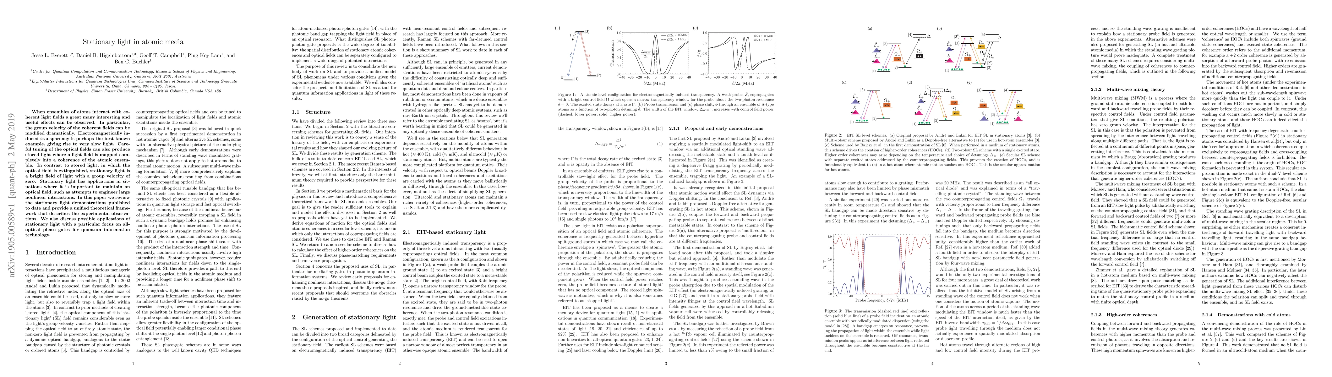 When ensembles of atoms interact with coherent light fields a great many interesting and useful effects can be observed. In particular, the group velocity of the coherent fields can be modified dramatically. Electromagnetically induced transparency is perhaps the best known example, giving rise to very slow light. Careful tuning of the optical fields can also produce stored light where a light field is mapped completely into a coherence of the atomic ensemble. In contrast to stored light, in which the optical field is extinguished, stationary light is a bright field of light with a group velocity of zero. Stationary light has applications in situations where it is important to maintain an optical field, such as attempts to engineer large nonlinear interactions. In this paper we review the stationary light demonstrations published to date and provide a unified theoretical framework that describes the experimental observations. We also discuss possible applications of stationary light with a particular focus on all-optical phase gates for quantum information technology.