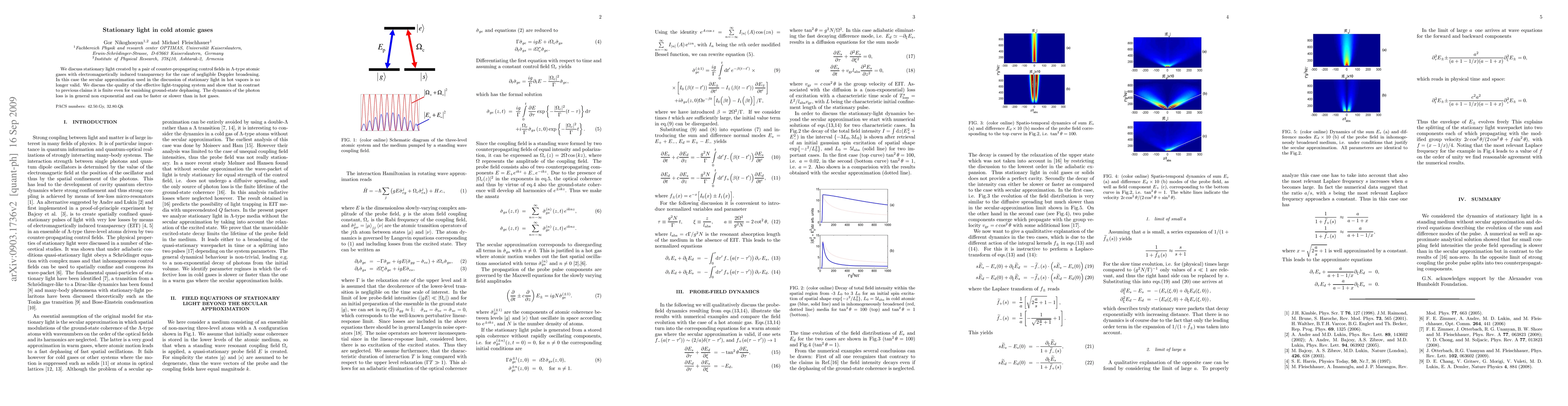 This paper explores stationary light in cold atomic gases using counter-propagating control fields, revealing that the effective light-trapping system maintains finite quality despite negligible ground-state dephasing. Unlike hot vapors, photon loss dynamics here are non-exponential and can vary in speed.