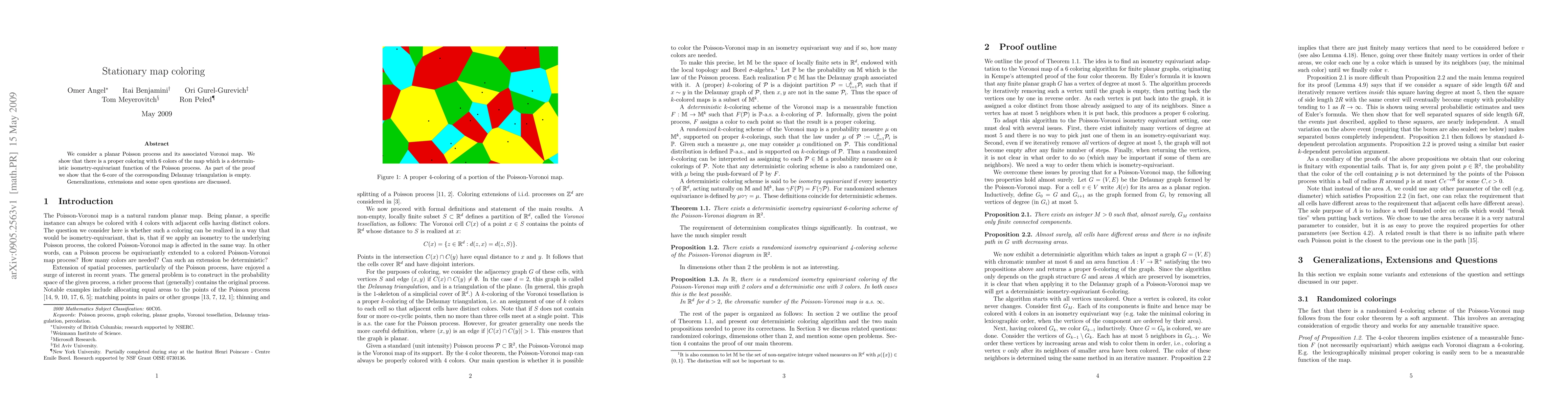 We consider a planar Poisson process and its associated Voronoi map. We show that there is a proper coloring with 6 colors of the map which is a deterministic isometry-equivariant function of the Poisson process. As part of the proof we show that the 6-core of the corresponding Delaunay triangulation is empty. Generalizations, extensions and some open questions are discussed.