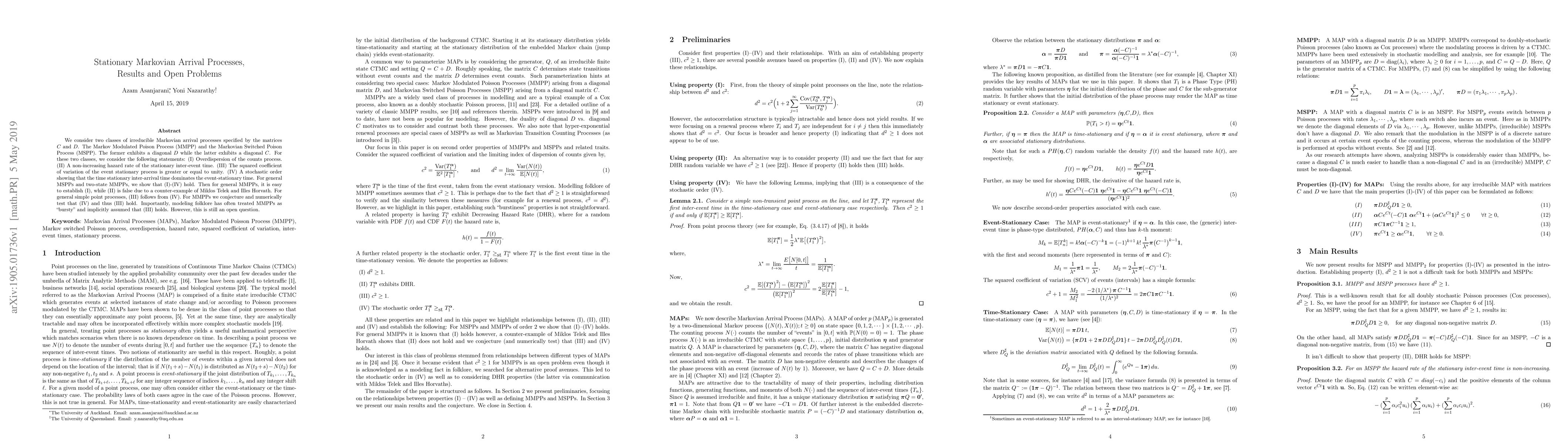 We consider two classes of irreducible Markovian arrival processes specified by the matrices $C$ and $D$. The Markov Modulated Poison Process (MMPP) and the Markovian Switched Poison Process (MSPP). The former exhibits a diagonal $D$ while the latter exhibits a diagonal $C$. For these two classes, we consider the following statements: (I) Overdispersion of the counts process. (II) A non-increasing hazard rate of the stationary inter-event time. (III) The squared coefficient of variation of the event stationary process is greater or equal to unity. (IV) A stochastic order showing that the time stationary inter-arrival time dominates the event-stationary time. For general MSPPs and two-state MMPPs, we show that (I)-(IV) hold. Then for general MMPPs, it is easy to establish (I), while (II) is false due to a counter-example of Miklos Telek and Illes Horvath. For general simple point processes, (III) follows from (IV). For MMPPs we conjecture and numerically test that (IV) and thus (III) hold. Importantly, modeling folklore has often treated MMPPs as ``bursty'' and implicitly assumed that (III) holds. However, this is still an open question.