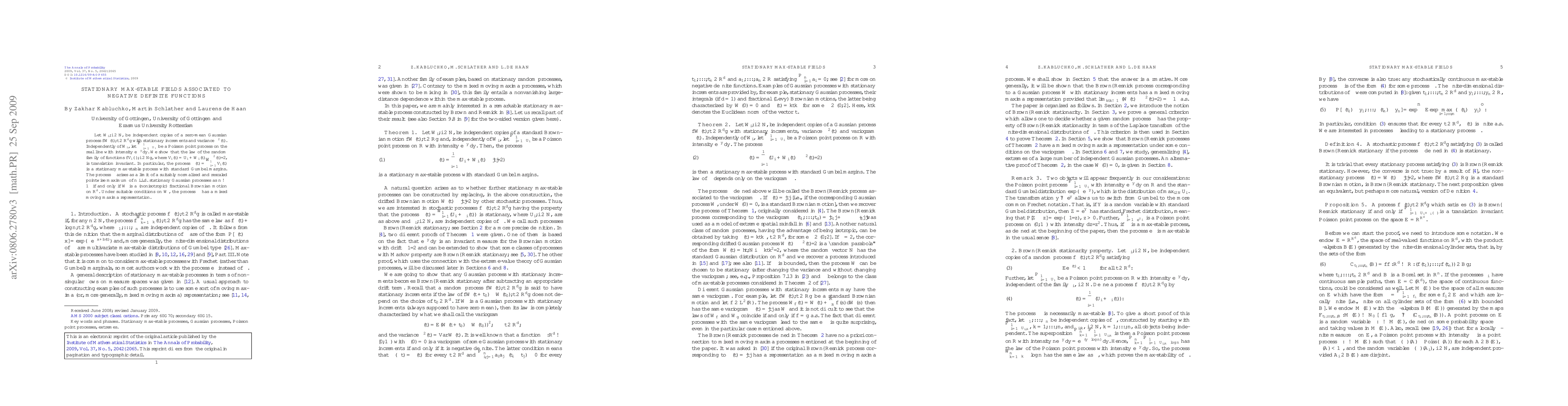 Let $W_i,i\in{\mathbb{N}}$, be independent copies of a zero-mean Gaussian process $\{W(t),t\in{\mathbb{R}}^d\}$ with stationary increments and variance $\sigma^2(t)$. Independently of $W_i$, let $\sum_{i=1}^{\infty}\delta_{U_i}$ be a Poisson point process on the real line with intensity $e^{-y} dy$. We show that the law of the random family of functions $\{V_i(\cdot),i\in{\mathbb{N}}\}$, where $V_i(t)=U_i+W_i(t)-\sigma^2(t)/2$, is translation invariant. In particular, the process $\eta(t)=\bigvee_{i=1}^{\infty}V_i(t)$ is a stationary max-stable process with standard Gumbel margins. The process $\eta$ arises as a limit of a suitably normalized and rescaled pointwise maximum of $n$ i.i.d. stationary Gaussian processes as $n\to\infty$ if and only if $W$ is a (nonisotropic) fractional Brownian motion on ${\mathbb{R}}^d$. Under suitable conditions on $W$, the process $\eta$ has a mixed moving maxima representation.