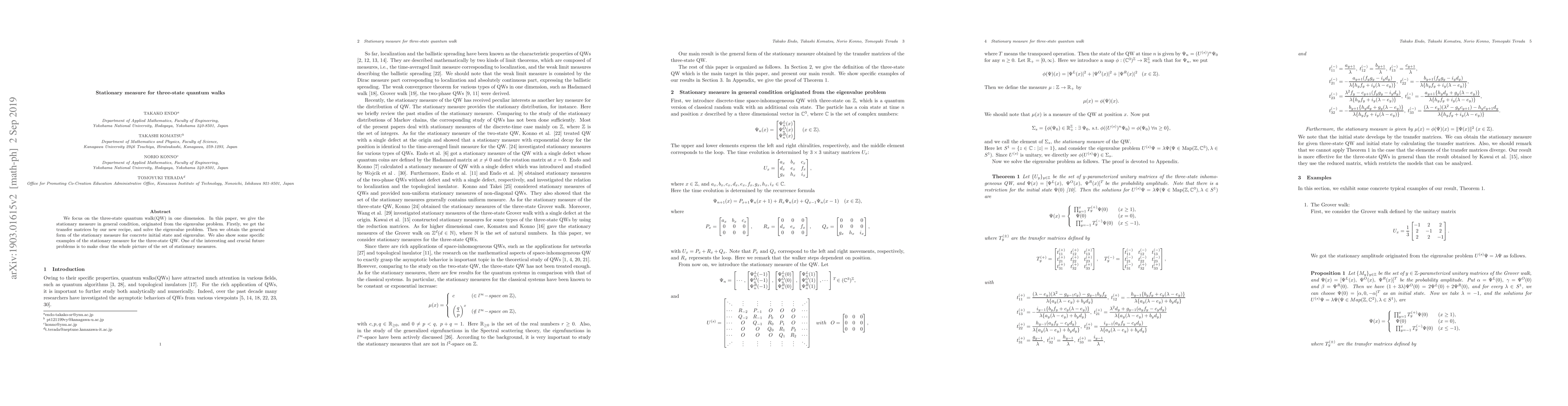 This paper derives the stationary measure for a three-state quantum walk in one dimension, solving the eigenvalue problem to obtain the general form. Specific examples of the stationary measure are provided, highlighting future work to fully understand the set of stationary measures.