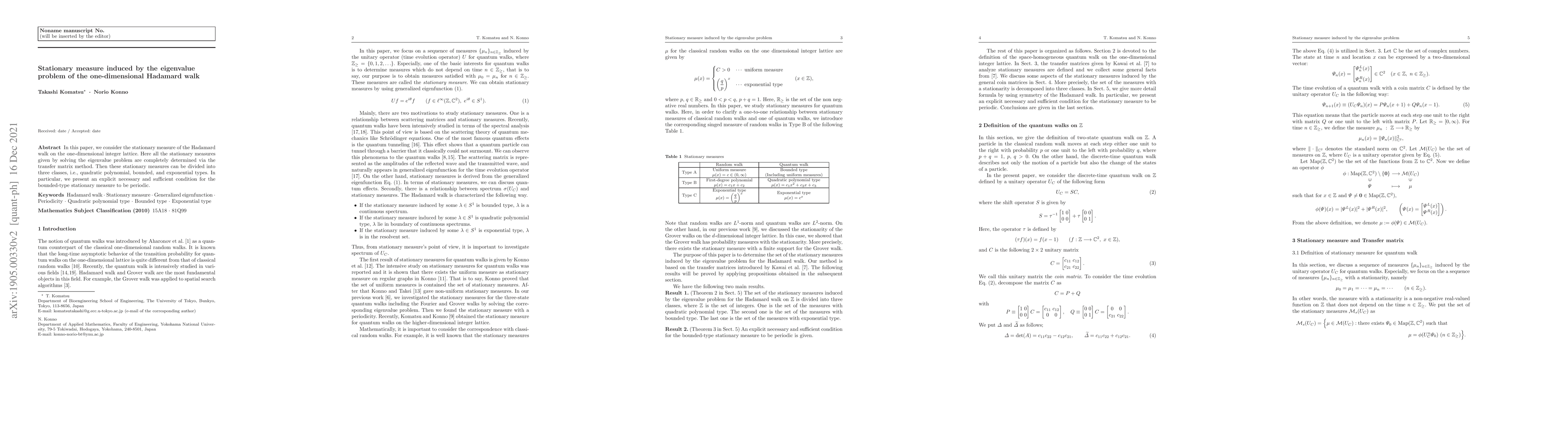 In this paper, we consider the stationary measure of the Hadamard walk on the one-dimensional integer lattice. Here all the stationary measures given by solving the eigenvalue problem are completely determined via the transfer matrix method. Then these stationary measures can be divided into three classes, i.e., quadratic polynomial, bounded, and exponential types. In particular, we present an explicit necessary and sufficient condition for the bounded-type stationary measure to be periodic.