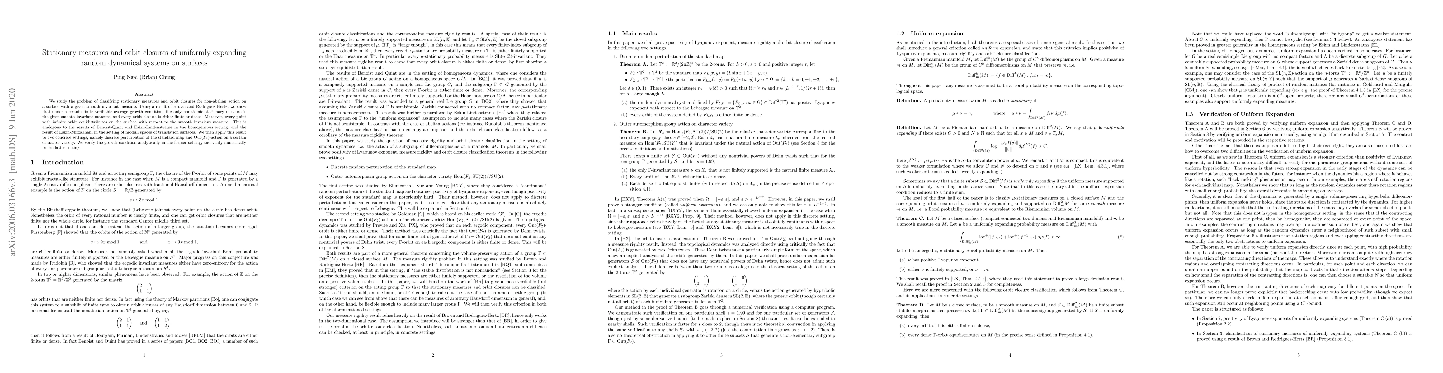 We study the problem of classifying stationary measures and orbit closures for non-abelian action on a surface with a given smooth invariant measure. Using a result of Brown and Rodriguez Hertz, we show that under a certain finite verifiable average growth condition, the only nonatomic stationary measure is the given smooth invariant measure, and every orbit closure is either finite or dense. Moreover, every point with infinite orbit equidistributes on the surface with respect to the smooth invariant measure. This is analogous to the results of Benoist-Quint and Eskin-Lindenstrauss in the homogeneous setting, and the result of Eskin-Mirzakhani in the setting of moduli spaces of translation surfaces. We then apply this result to two concrete settings, namely discrete perturbation of the standard map and Out($F_2$)-action on a certain character variety. We verify the growth condition analytically in the former setting, and verify numerically in the latter setting.