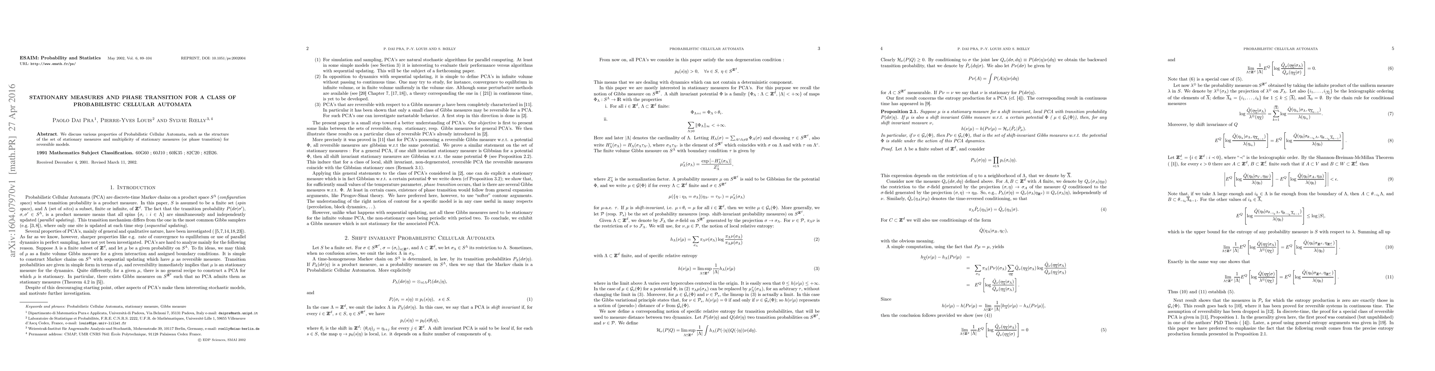 This paper explores probabilistic cellular automata, focusing on stationary measures and phase transitions in reversible models. It discusses the structure of stationary measures and their multiplicity, shedding light on the properties of these systems.