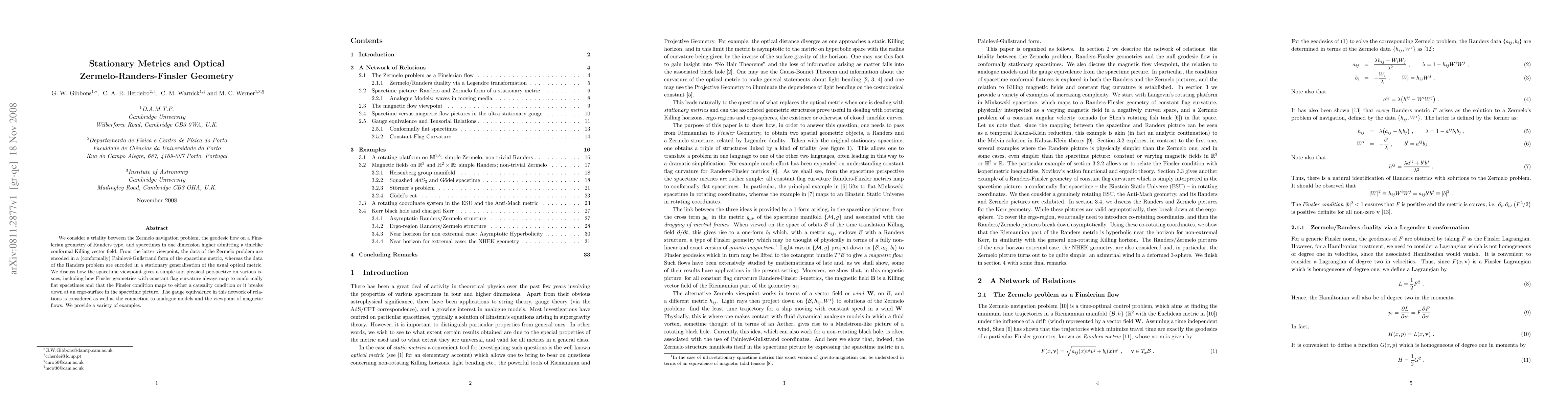 We consider a triality between the Zermelo navigation problem, the geodesic flow on a Finslerian geometry of Randers type, and spacetimes in one dimension higher admitting a timelike conformal Killing vector field. From the latter viewpoint, the data of the Zermelo problem are encoded in a (conformally) Painleve-Gullstrand form of the spacetime metric, whereas the data of the Randers problem are encoded in a stationary generalisation of the usual optical metric. We discuss how the spacetime viewpoint gives a simple and physical perspective on various issues, including how Finsler geometries with constant flag curvature always map to conformally flat spacetimes and that the Finsler condition maps to either a causality condition or it breaks down at an ergo-surface in the spacetime picture. The gauge equivalence in this network of relations is considered as well as the connection to analogue models and the viewpoint of magnetic flows. We provide a variety of examples.