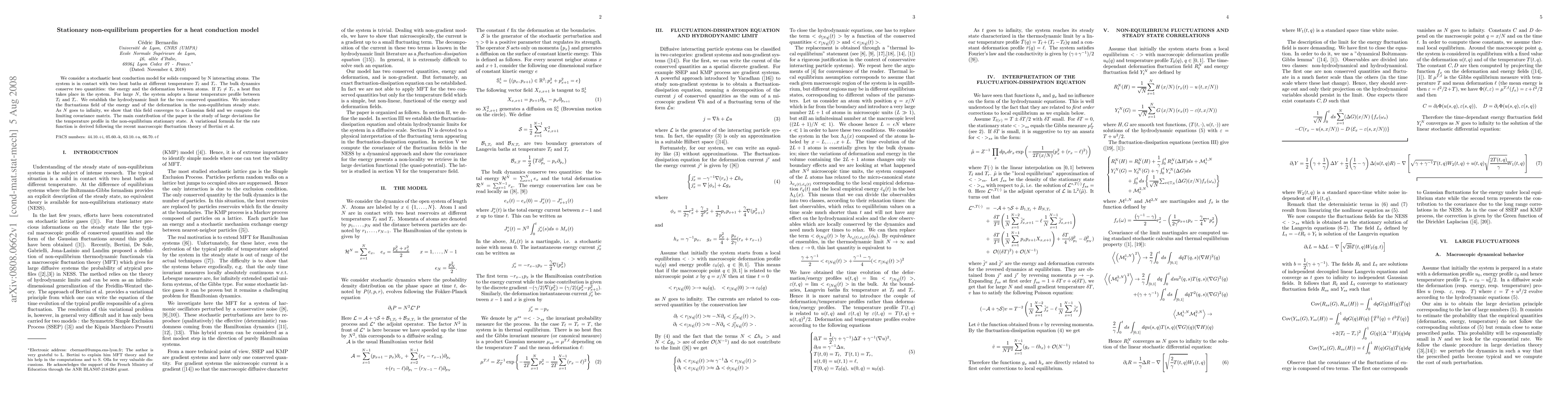 This paper investigates a stochastic heat conduction model for solids with interacting atoms in contact with two heat baths at different temperatures, leading to a non-equilibrium steady state. It establishes the hydrodynamic limit for energy and deformation, and derives a variational formula for large deviations in the temperature profile using macroscopic fluctuation theory.