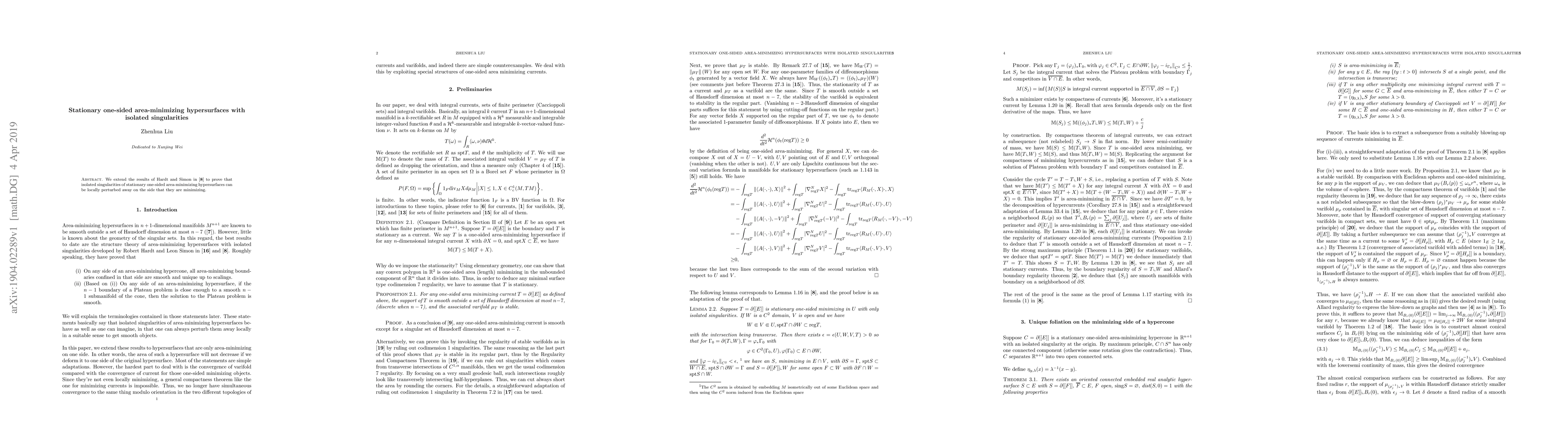 This paper extends Hardt and Simon's findings on area-minimizing cones to demonstrate that isolated singularities in stationary one-sided area-minimizing hypersurfaces can be locally removed from the minimizing side. This provides new insights into the behavior of such hypersurfaces near singularities.