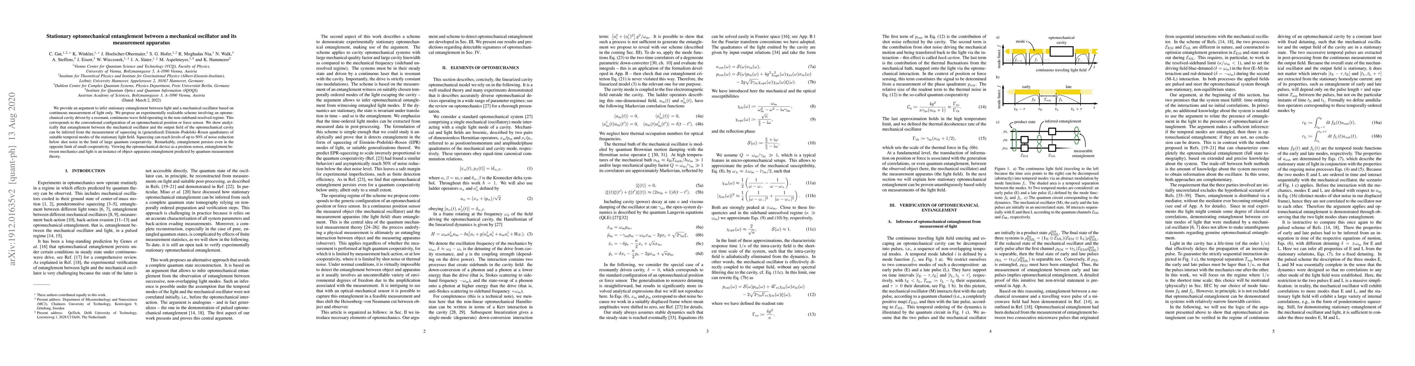 We provide an argument to infer stationary entanglement between light and a mechanical oscillator based on continuous measurement of light only. We propose an experimentally realizable scheme involving an optomechanical cavity driven by a resonant, continuous-wave field operating in the non-sideband-resolved regime. This corresponds to the conventional configuration of an optomechanical position or force sensor. We show analytically that entanglement between the mechanical oscillator and the output field of the optomechanical cavity can be inferred from the measurement of squeezing in (generalized) Einstein-Podolski-Rosen quadratures of suitable temporal modes of the stationary light field. Squeezing can reach levels of up to 50% of noise reduction below shot noise in the limit of large quantum cooperativity. Remarkably, entanglement persists even in the opposite limit of small cooperativity. Viewing the optomechanical device as a position sensor, entanglement between mechanics and light is an instance of object-apparatus entanglement predicted by quantum measurement theory.