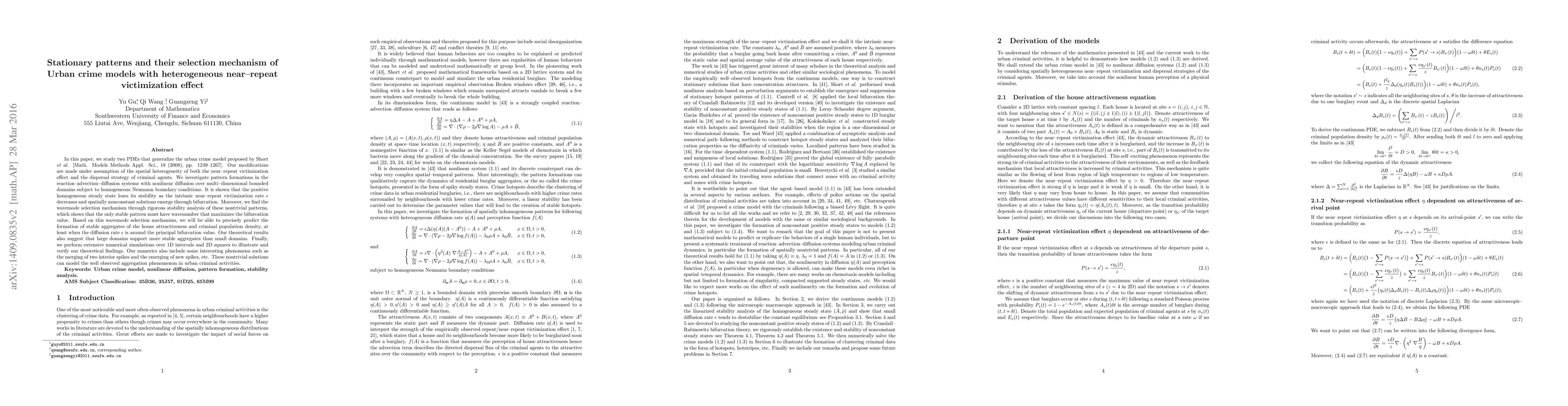 In this paper, we study two PDEs that generalize the urban crime model proposed by Short \emph{et al}. [Math. Models Methods Appl. Sci., 18 (2008), pp. 1249-1267]. Our modifications are made under assumption of the spatial heterogeneity of both the near-repeat victimization effect and the dispersal strategy of criminal agents. We investigate pattern formations in the reaction-advection-diffusion systems with nonlinear diffusion over multi-dimensional bounded domains subject to homogeneous Neumann boundary conditions. It is shown that the positive homogeneous steady state loses its stability as the intrinsic near-repeat victimization rate $\epsilon$ decreases and spatially nonconstant solutions emerge through bifurcation. Moreover, we find the wavemode selection mechanism through rigorous stability analysis of these nontrivial patterns, which shows that the only stable pattern must have wavenumber that maximizes the bifurcation value. Based on this wavemode selection mechanism, we will be able to precisely predict the formation of stable aggregates of the house attractiveness and criminal population density, at least when the diffusion rate $\epsilon$ is around the principal bifurcation value. Our theoretical results also suggest that large domains support more stable aggregates than small domains. Finally, we perform extensive numerical simulations over 1D intervals and 2D squares to illustrate and verify our theoretical findings. Our numerics also include some interesting phenomena such as the merging of two interior spikes and the emerging of new spikes, etc. These nontrivial solutions can model the well observed aggregation phenomenon in urban criminal activities.