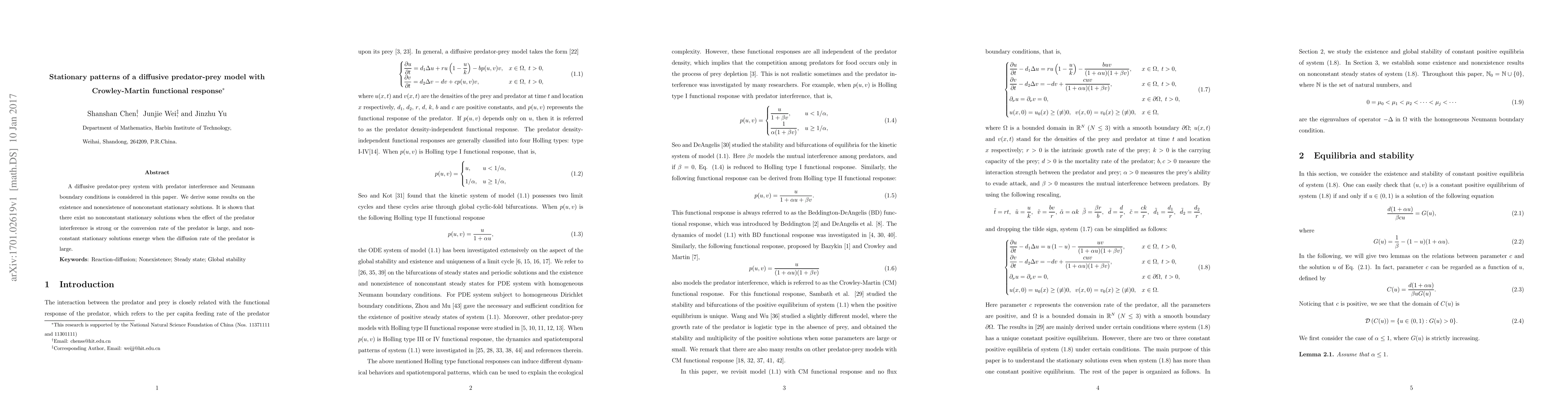 A diffusive predator-prey system with predator interference and Neumann boundary conditions is considered in this paper. We derive some results on the existence and nonexistence of nonconstant stationary solutions. It is shown that there exist no nonconstant stationary solutions when the effect of the predator interference is strong or the conversion rate of the predator is large, and nonconstant stationary solutions emerge when the diffusion rate of the predator is large.