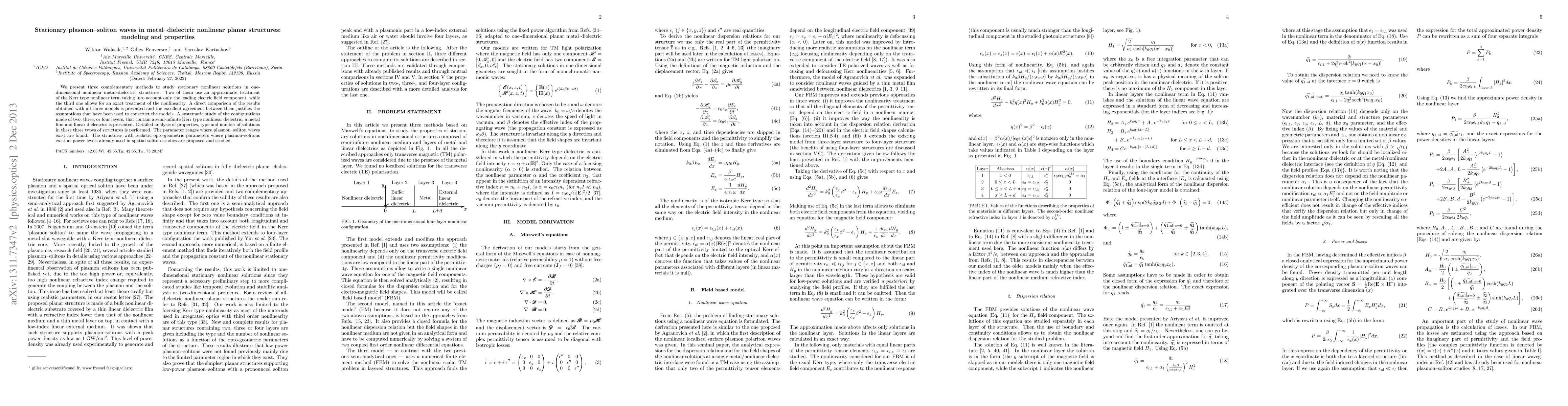 We present three complementary methods to study stationary nonlinear solutions in one-dimensional nonlinear metal-dielectric structures. Two of them use an approximate treatment of the Kerr type nonlinear term taking into account only the leading electric field component, while the third one allows for an exact treatment of the nonlinearity. A direct comparison of the results obtained with all three models is presented and the excellent agreement between them justifies the assumptions that have been used to construct the models. A systematic study of the configurations made of two, three, or four layers, that contain a semi-infinite Kerr type nonlinear dielectric, a metal film and linear dielectrics is presented. Detailed analysis of properties, type and number of solutions in these three types of structures is performed. The parameter ranges where plasmon-soliton waves exist are found. The structures with realistic opto-geometric parameters where plasmon-solitons exist at power levels already used in spatial soliton studies are proposed and studied.