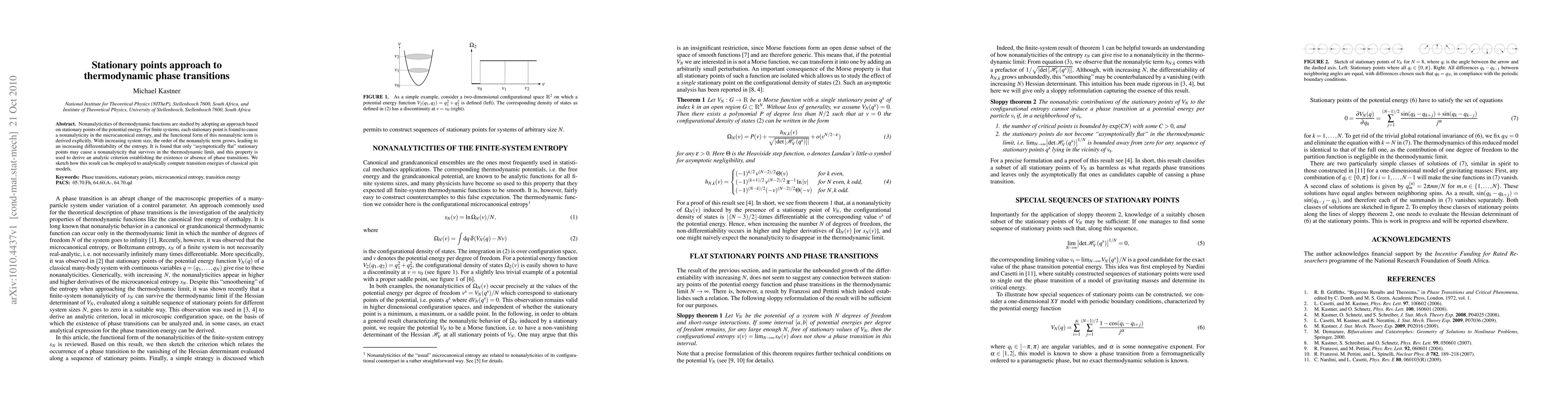 This paper explores thermodynamic phase transitions using stationary points of potential energy, showing that finite systems exhibit nonanalyticities in microcanonical entropy due to these points. The study reveals that only "asymptotically flat" stationary points can lead to nonanalyticities persisting in the thermodynamic limit, thereby providing an analytic criterion for phase transition existence.