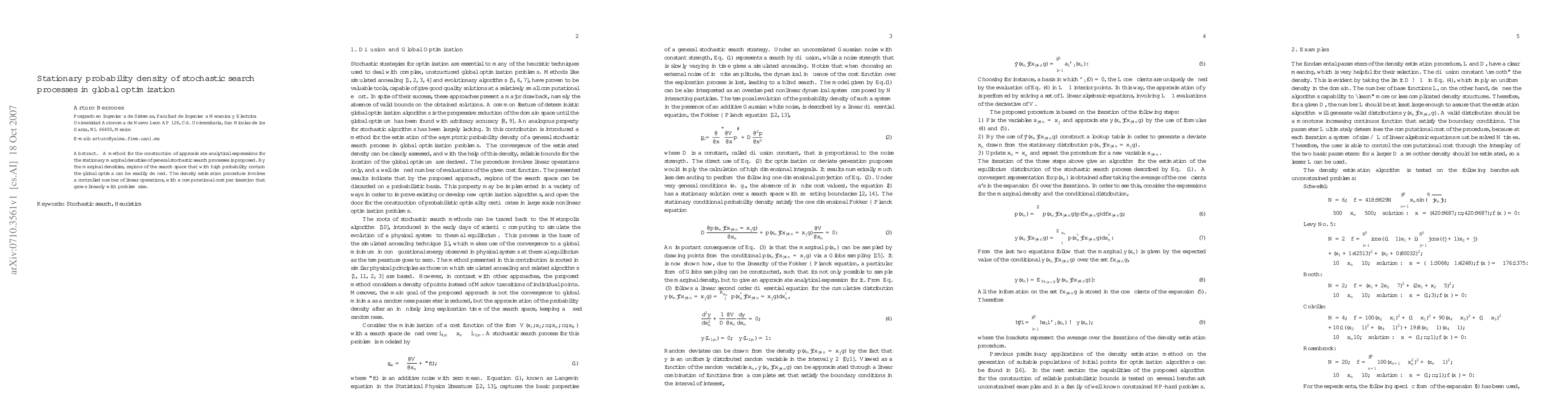 A method for the construction of approximate analytical expressions for the stationary marginal densities of general stochastic search processes is proposed. By the marginal densities, regions of the search space that with high probability contain the global optima can be readily defined. The density estimation procedure involves a controlled number of linear operations, with a computational cost per iteration that grows linearly with problem size.