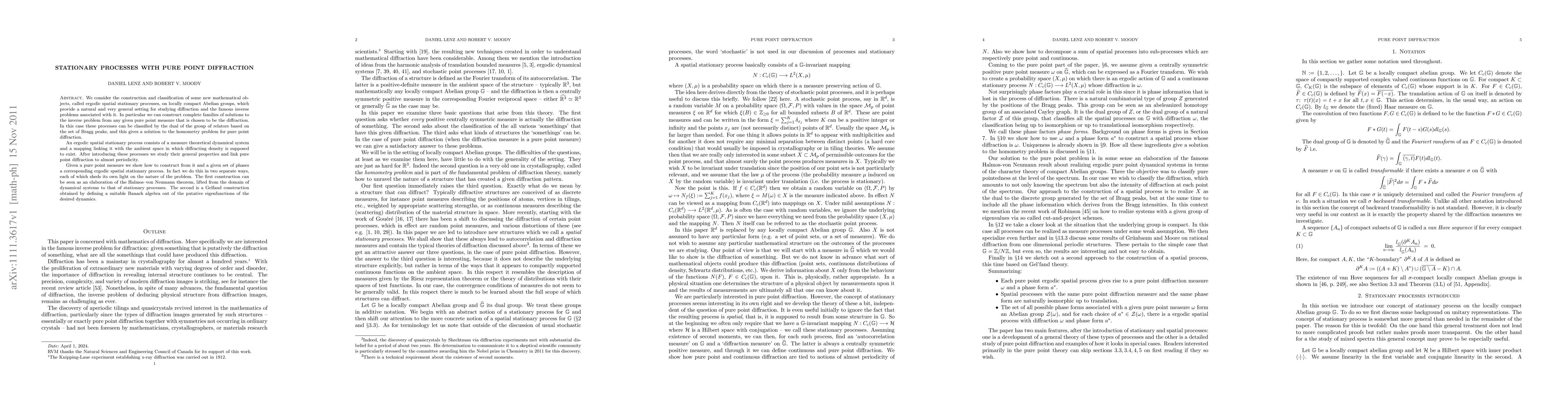 This paper constructs and classifies ergodic spatial stationary processes on locally compact Abelian groups to study diffraction and inverse problems. It provides two constructions for linking pure point measures to these processes, solving the homometry problem for pure point diffraction.