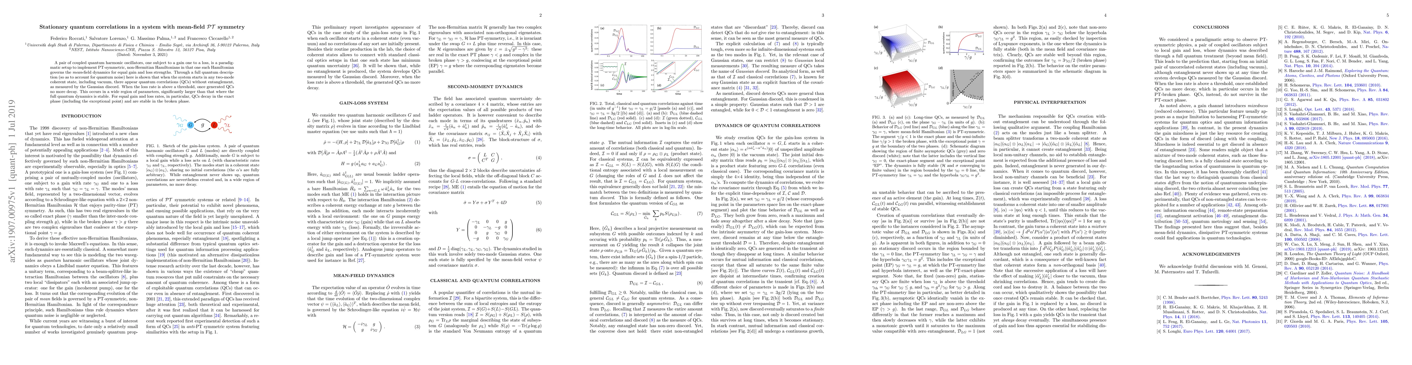 A pair of coupled quantum harmonic oscillators, one subject to a gain one to a loss, is a paradigmatic setup to implement PT-symmetric, non-Hermitian Hamiltonians in that one such Hamiltonian governs the mean-field dynamics for equal gain and loss strengths. Through a full quantum description (so as to account for quantum noise) here is shown that when the system starts in any two-mode coherent state, including vacuum, there appear quantum correlations (QCs) without entanglement, as measured by the Gaussian discord. When the loss rate is above a threshold, once generated QCs no more decay. This occurs in a wide region of parameters, significantly larger than that where the full quantum dynamics is stable. For equal gain and loss rates, in particular, QCs decay in the exact phase (including the exceptional point) and are stable in the broken phase.