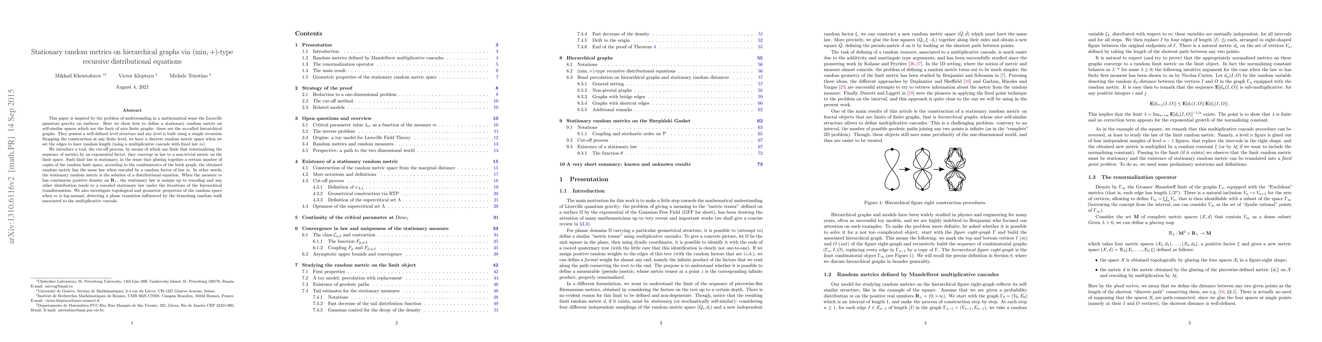 This paper is inspired by the problem of understanding in a mathematical sense the Liouville quantum gravity on surfaces. Here we show how to define a stationary random metric on self-similar spaces which are the limit of nice finite graphs: these are the so-called hierarchical graphs. They possess a well-defined level structure and any level is built using a simple recursion. Stopping the construction at any finite level, we have a discrete random metric space when we set the edges to have random length (using a multiplicative cascade with fixed law $m$). We introduce a tool, the cut-off process, by means of which one finds that renormalizing the sequence of metrics by an exponential factor, they converge in law to a non-trivial metric on the limit space. Such limit law is stationary, in the sense that glueing together a certain number of copies of the random limit space, according to the combinatorics of the brick graph, the obtained random metric has the same law when rescaled by a random factor of law $m$. In other words, the stationary random metric is the solution of a distributional equation. When the measure $m$ has continuous positive density on $\mathbf{R}_+$, the stationary law is unique up to rescaling and any other distribution tends to a rescaled stationary law under the iterations of the hierarchical transformation. We also investigate topological and geometric properties of the random space when $m$ is $\log$-normal, detecting a phase transition influenced by the branching random walk associated to the multiplicative cascade.
