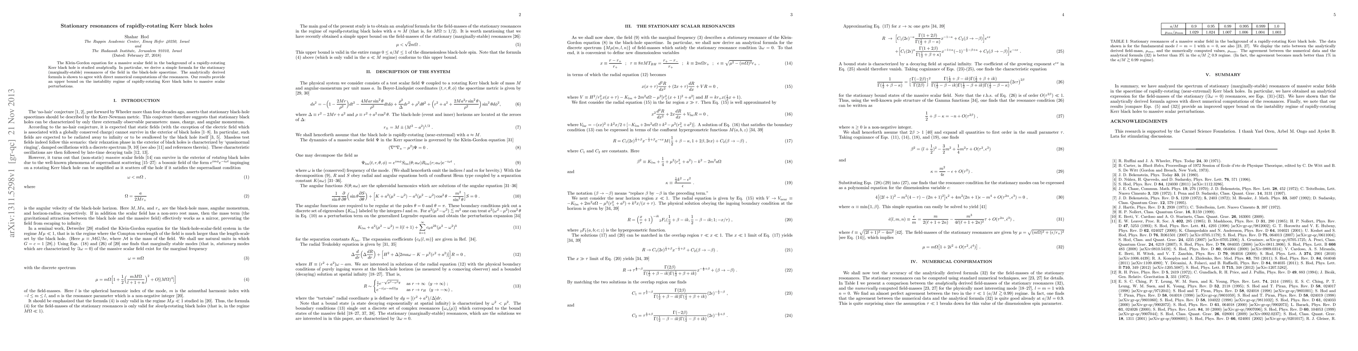 Summary: This paper analytically derives a formula for the stationary resonances of massive scalar fields around rapidly-rotating Kerr black holes, showing agreement with numerical computations and providing an upper bound on instability to scalar perturbations.