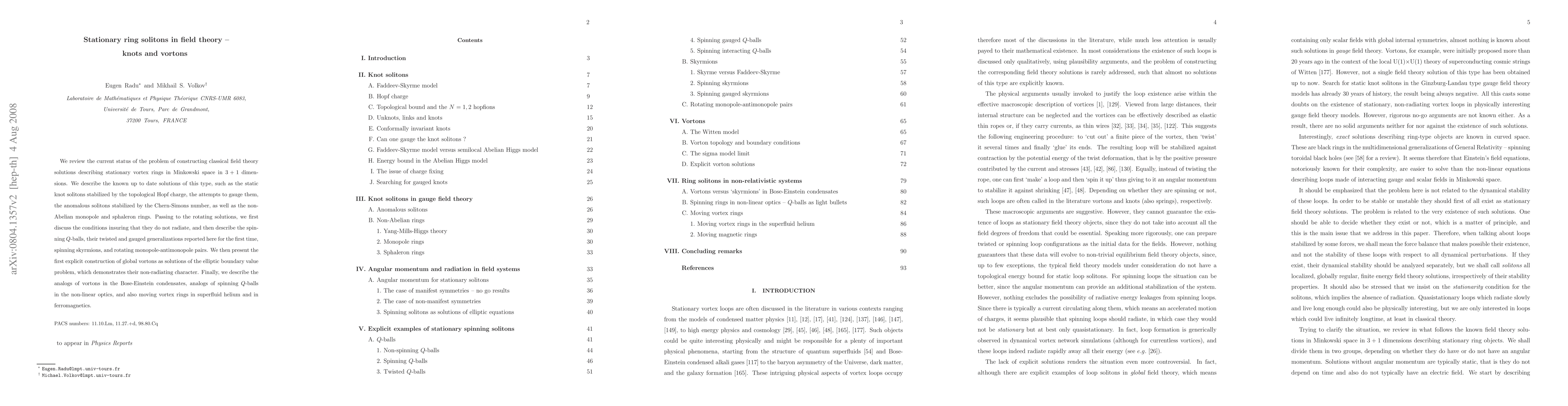 We review the current status of the problem of constructing classical field theory solutions describing stationary vortex rings in Minkowski space in 3+1 dimensions. We describe the known up to date solutions of this type, such as the static knot solitons stabilized by the topological Hopf charge, the attempts to gauge them, the anomalous solitons stabilized by the Chern-Simons number, as well as the non-Abelian monopole and sphaleron rings. Passing to the rotating solutions, we first discuss the conditions insuring that they do not radiate, and then describe the spinning $Q$-balls, their twisted and gauged generalizations reported here for the first time, spinning skyrmions, and rotating monopole-antimonopole pairs. We then present the first explicit construction of global vortons as solutions of the elliptic boundary value problem, which demonstrates their non-radiating character. Finally, we describe the analogs of vortons in the Bose-Einstein condensates, analogs of spinning $Q$-balls in the non-linear optics, and also moving vortex rings in superfluid helium and in ferromagnetics.