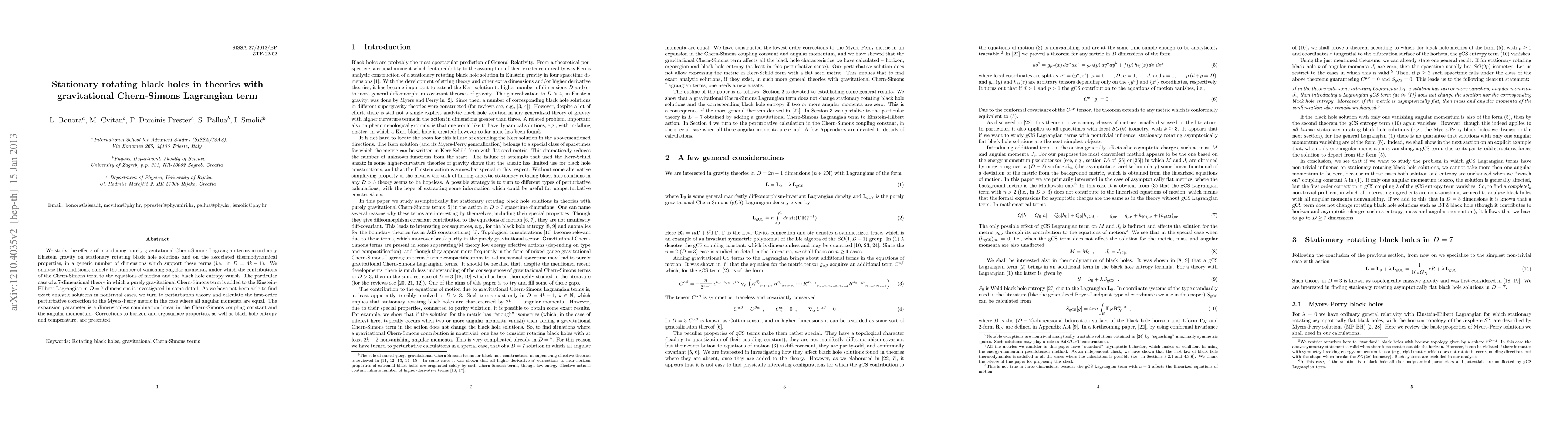 This paper investigates the impact of gravitational Chern-Simons terms in Einstein gravity on stationary rotating black holes, focusing on thermodynamic properties and perturbative corrections to the Myers-Perry metric in 7 dimensions. It finds that Chern-Simons contributions vanish under specific angular momentum conditions.
