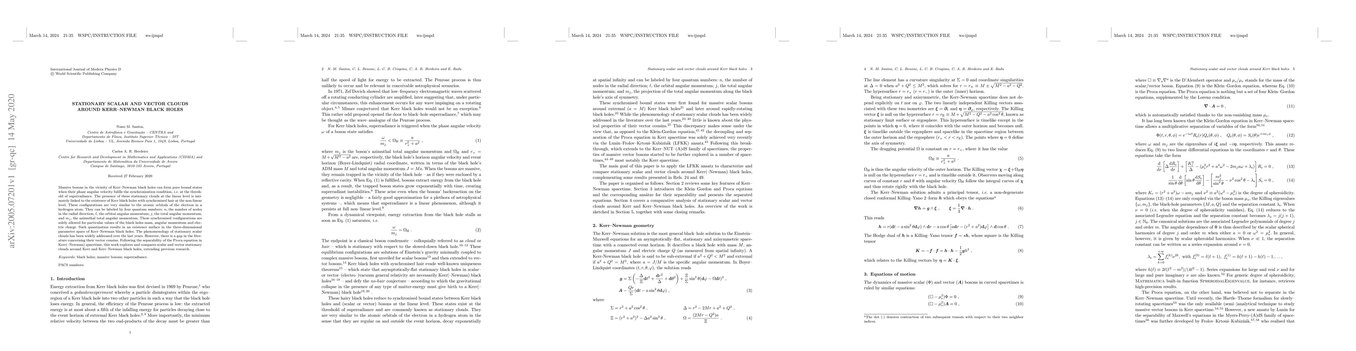 Massive bosons in the vicinity of Kerr-Newman black holes can form pure bound states when their phase angular velocity fulills the synchronisation condition, i.e. at the threshold of superradiance. The presence of these stationary clouds at the linear level is intimately linked to the existence of Kerr black holes with synchronised hair at the non-linear level. These configurations are very similar to the atomic orbitals of the electron in a hydrogen atom. They can be labeled by four quantum numbers: $n$, the number of nodes in the radial direction; $\ell$, the orbital angular momentum; $j$, the total angular momentum; and $m_j$, the azimuthal total angular momentum. These synchronised configurations are solely allowed for particular values of the black hole's mass, angular momentum and electric charge. Such quantization results in an existence surface in the three-dimensional parameter space of Kerr-Newman black holes. The phenomenology of stationary scalar clouds has been widely addressed over the last years. However, there is a gap in the literature concerning their vector cousins. Following the separability of the Proca equation in Kerr(-Newman) spacetime, this work explores and compares scalar and vector stationary clouds around Kerr and Kerr-Newman black holes, extending previous research.