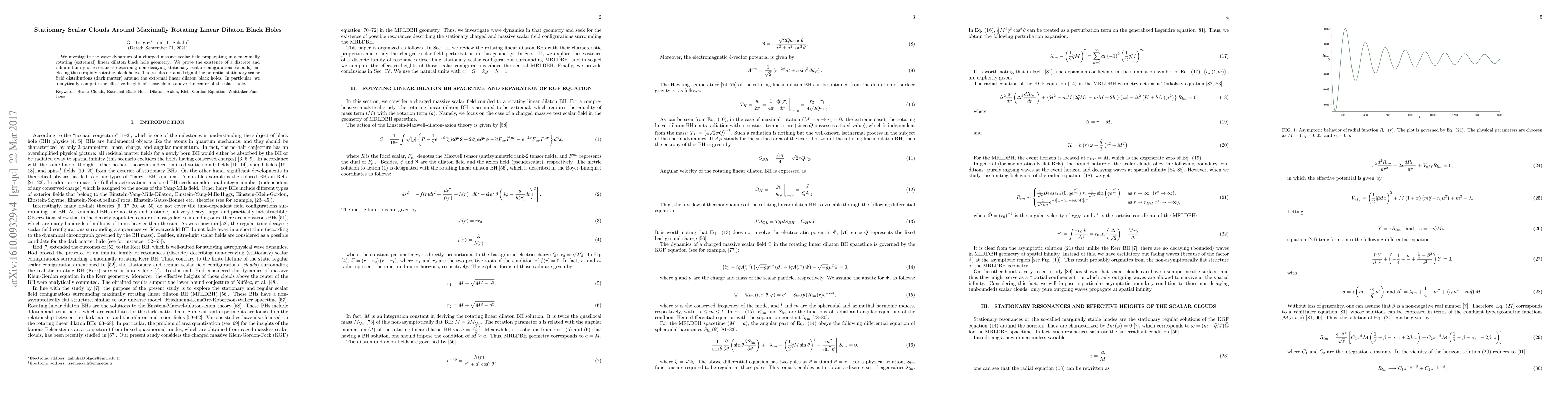 This study examines the wave dynamics of a charged massive scalar field around a maximally rotating linear dilaton black hole, revealing a discrete family of resonances forming non-decaying stationary scalar clouds. Analytically computed effective heights of these clouds provide insights into potential stationary scalar field distributions akin to dark matter around such black holes.