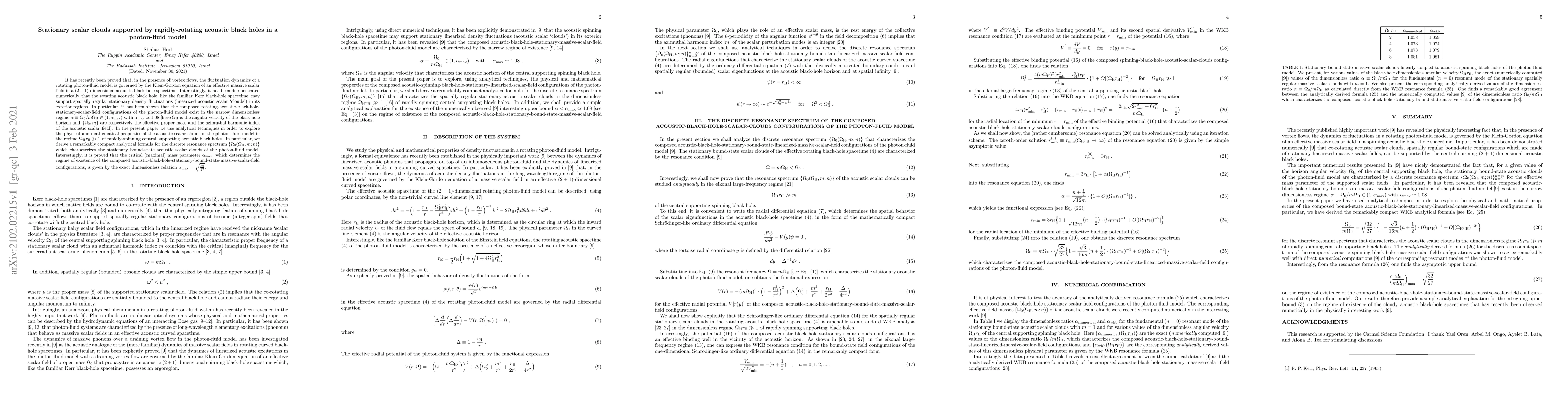 It has recently been proved that, in the presence of vortex flows, the fluctuation dynamics of a rotating photon-fluid model is governed by the Klein-Gordon equation of an effective massive scalar field in a $(2+1)$-dimensional acoustic black-hole spacetime. Interestingly, it has been demonstrated numerically that the rotating acoustic black hole, like the familiar Kerr black-hole spacetime, may support spatially regular stationary density fluctuations (linearized acoustic scalar `clouds') in its exterior regions. In particular, it has been shown that the composed rotating-acoustic-black-hole-stationary-scalar-field configurations of the photon-fluid model exist in the narrow dimensionless regime $\alpha\equiv\Omega_0/m\Omega_{\text{H}}\in(1,\alpha_{\text{max}})$ with $\alpha_{\text{max}}\simeq 1.08$ [here $\Omega_{\text{H}}$ is the angular velocity of the black-hole horizon and $\{\Omega_0,m\}$ are respectively the effective proper mass and the azimuthal harmonic index of the acoustic scalar field]. In the present paper we use analytical techniques in order to explore the physical and mathematical properties of the acoustic scalar clouds of the photon-fluid model in the regime $\Omega_{\text{H}}r_{\text{H}}\gg1$ of rapidly-spinning central supporting acoustic black holes. In particular, we derive a remarkably compact analytical formula for the discrete resonance spectrum $\{\Omega_0(\Omega_{\text{H}},m;n)\}$ which characterizes the stationary bound-state acoustic scalar clouds of the photon-fluid model. Interestingly, it is proved that the critical (maximal) mass parameter $\alpha_{\text{max}}$, which determines the regime of existence of the composed acoustic-black-hole-stationary-bound-state-massive-scalar-field configurations, is given by the exact dimensionless relation $\alpha_{\text{max}}=\sqrt{{{32}\over{27}}}$.
